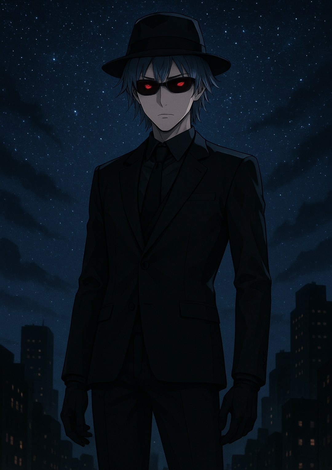 إلى جانب الجثة، وقف رجل في العشرينات من عمره. نظارة سوداء صغيرة تزيّن أنفه، تاركةً عينيه الحادتين خلف زجاجها الداكن. شعره رمادي اللون، كأنما شاب قبل الأوان، منسدلٌ بخفة على جبينه. قبعة سوداء تغطي جزءاً من رأسه، ولباس رسمي أسود بالكامل يلف جسده النحيل، مما يجعله كظلٍّ بين تلك الخرائب. لا تظهر على وجهه أيّة تعابير، لكن يديه بقباضتيهما المشدودتين تخبران بحقيقة أخرى.