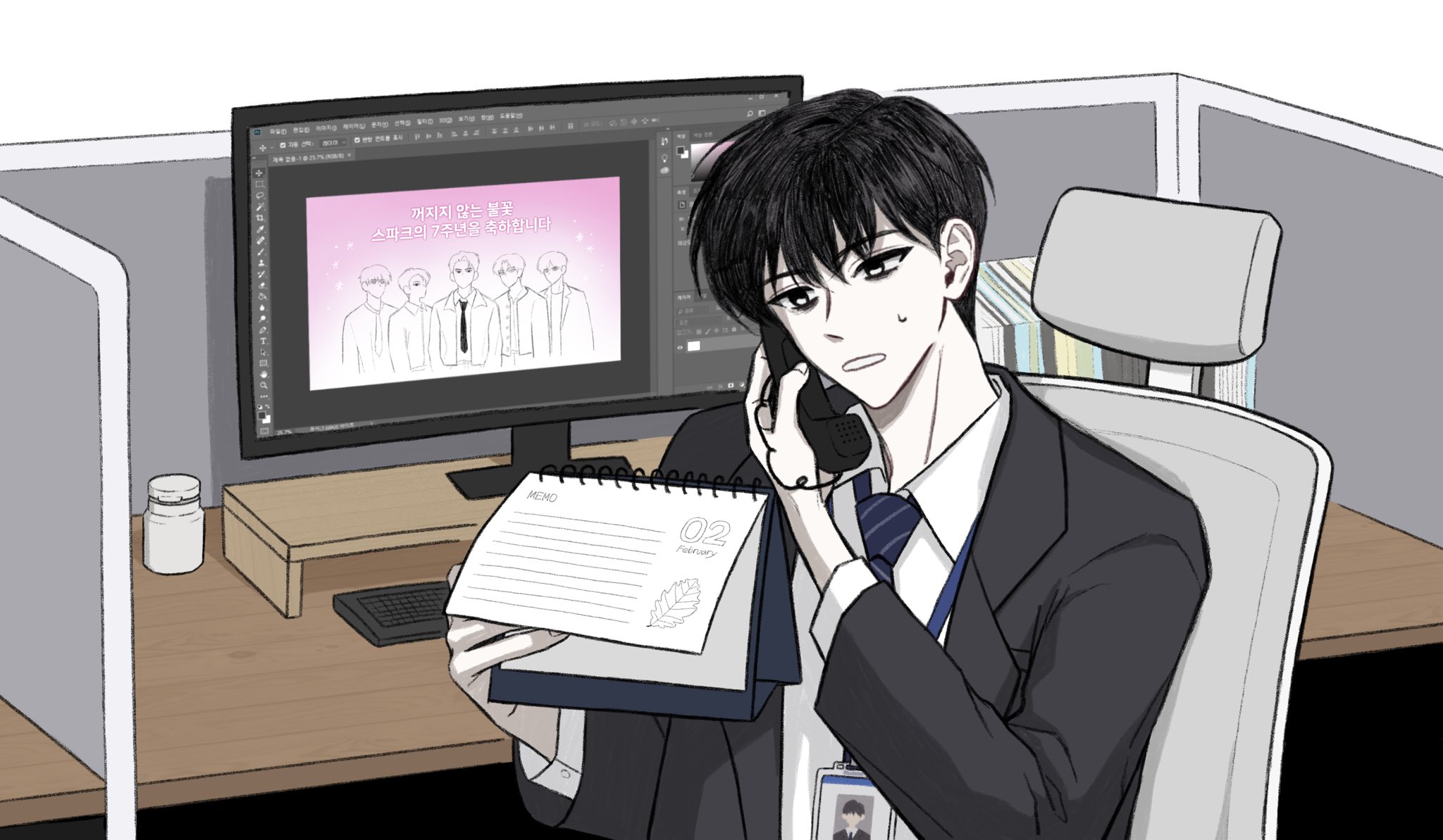 "سنمضي دون أي تعديل على الجداول، صحيح...؟ سأترك موعد تسليم تصميم الرقصات فارغًا وأرسله. تشونغهـيون، يجب إنجاز إعادة التوزيع قبل ذلك، هل هذا ممكن؟"