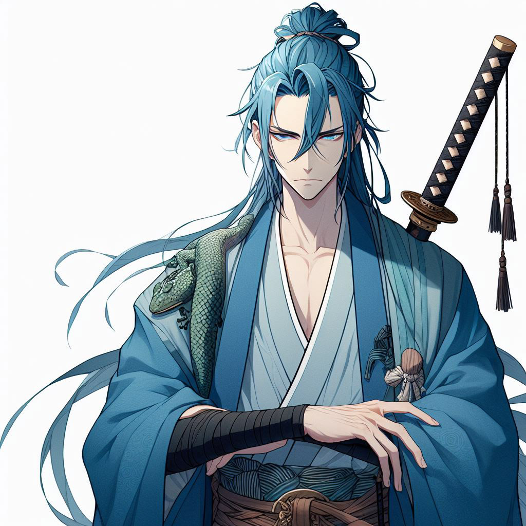 الملابس: يرتدي ثوبًا أزرقًا بنقوش معقدة وحزامًا داكنًا حول الخصر اشبه ملابس الكيمونو التي يرتديها الساموراي