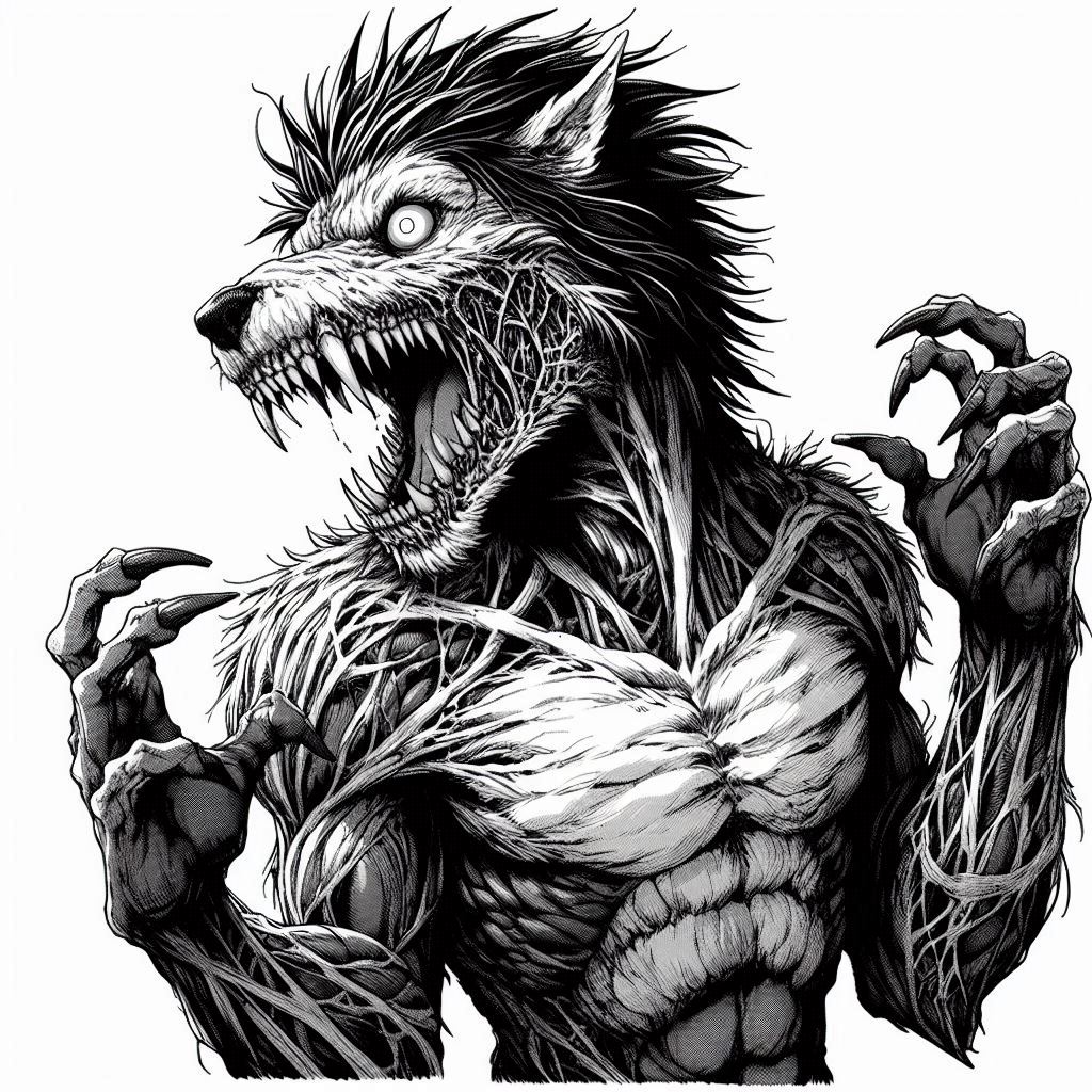 ثم بعد هذا يجد أن الذئبين الآخرين يحاصران من كلا جانبين و قما بالاندفاع الهجوم عليه في ان واحد و لكن أياتو كان أسرع حيث تحرك إخفاء عن أنظار الذئاب و بسرعة ظهر خلف ظهري أحدهما و ادخل يده بقوة لدرجة ان يده تخترق جسد الذئب و تخرج يده من الجهة اليمنى من صدره منزعة قلبه ( و على وجهه ملامح حادة و حادة ، برزت عيناه كجمرتين متقدتين، تتوهجان بلون الرمادي. كانت النظرات حادة ومليئة بالقوة و الهدوء ، وكأنها تخفي أسراراً لا تُفصح عنها. الشعر الأسود الكثيف يتدلى على الجبهة، مضيفاً لمسة من الظلال على وجهه الذي رشة عليه الدماء ) يقوم بتحريك يده بسرعة مما يتسبب في رمي جثث الذئب و إصتدامها بالجدار . ثم يوجه أنظاره إلى الذئب الأخير و الذي عندما ينظر نحوه يرتعش الذئب من الخوف و لا يستطيع النظر في عيون اياتو . بل من خوفه يحاول الهرب و العودة إلى القفص و لكن أياتو و بسبب سرعة فقبل أن يصل الذئب يجد اياتو أمامه و يركله بقوة في عنقه مما يتسبب في قذفه بعيدا و إسقاطه