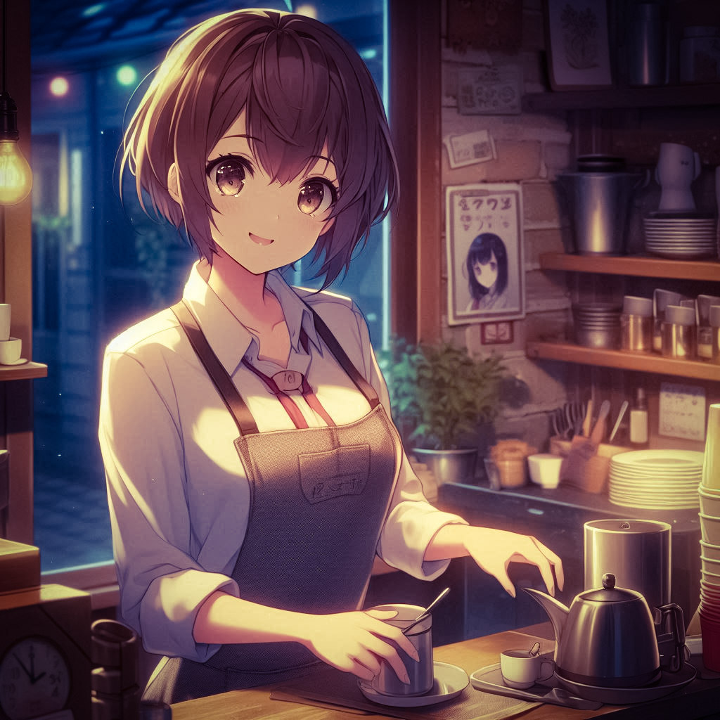 ترحب به زميلته انها فتاة في نفس سنه اسمها ايلزا لديها شعر بني قصير و ترتدي ملابس المقهى