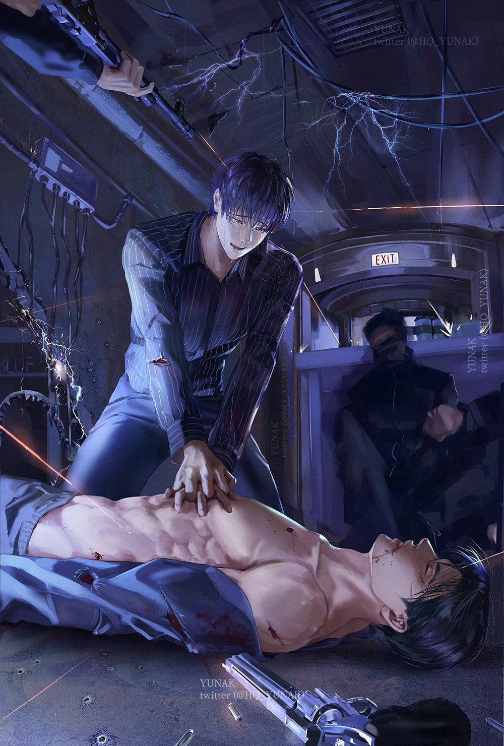 إغلاق عيني ومجرد سماع الضجيج جعلني أكثر خوفًا. أدرت رأسي وفتحت عيني. الأشخاص الثلاثة الذين ضغطوا عليّ بمجرد دخولهم غرفة الأستشارة ما زالوا واقفين، بغض النظر عما إذا كان الرصاص قد اخترق أجسادهم أم لا.