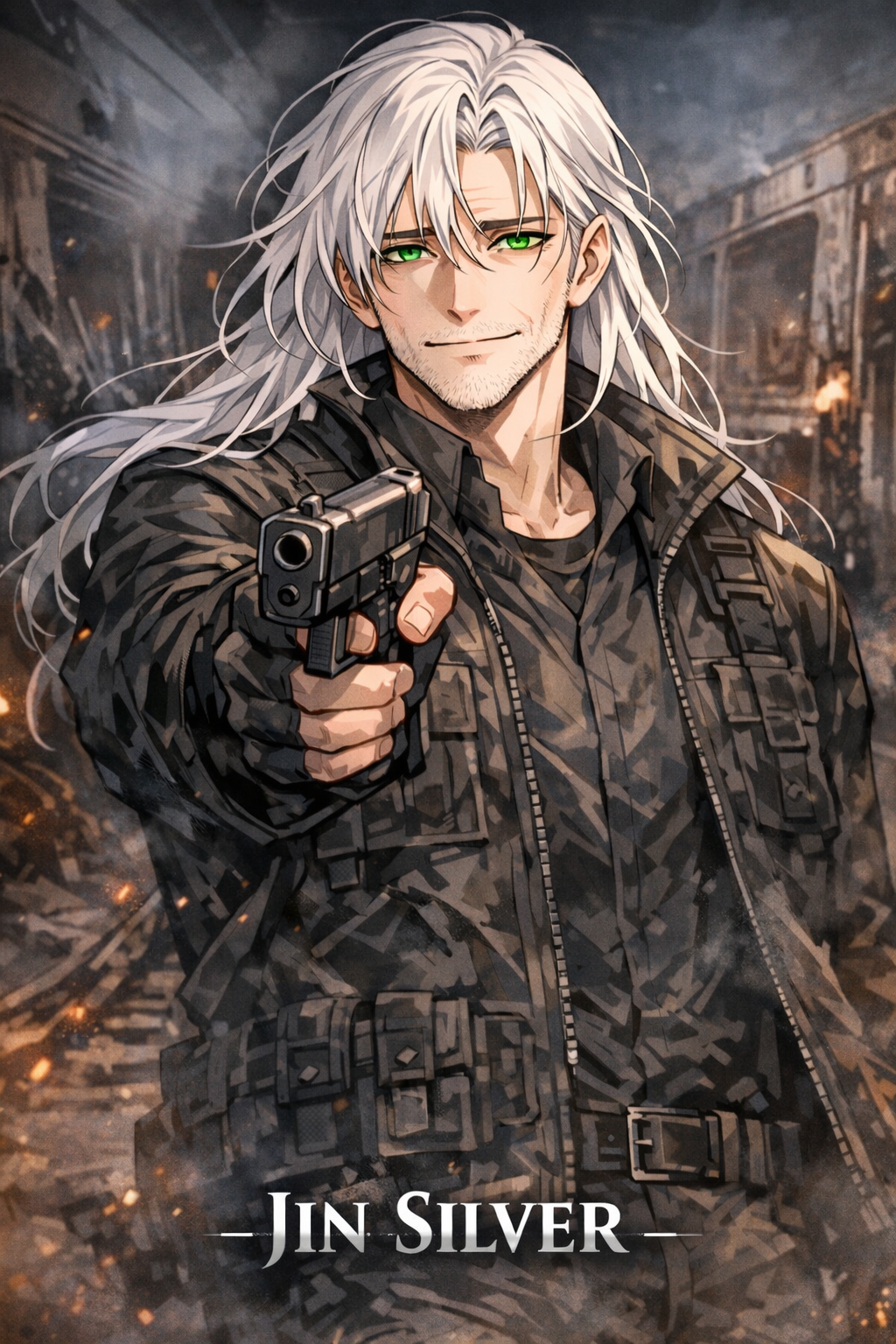 "بشرة برونزية. عيون صفراء زاهية. طول يزيد عن 180 سم. شعر أبيض ناصع طويل بما يكفي ليصل إلى خصرك. ملامح واضحة وجذابة. وتحمل سيفًا."