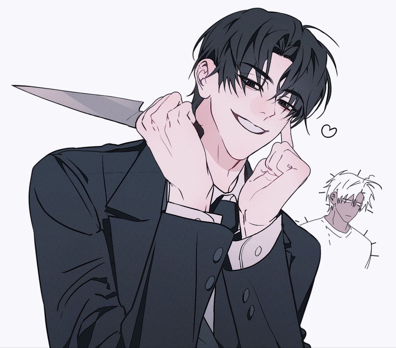 رجل وسيم جلس على ركبةٍ واحدة، ممسكًا بسكين الساشيمي، يبتسم ابتسامة جميلة. وتحته، جثة ملقاة فاقدة للوعي.