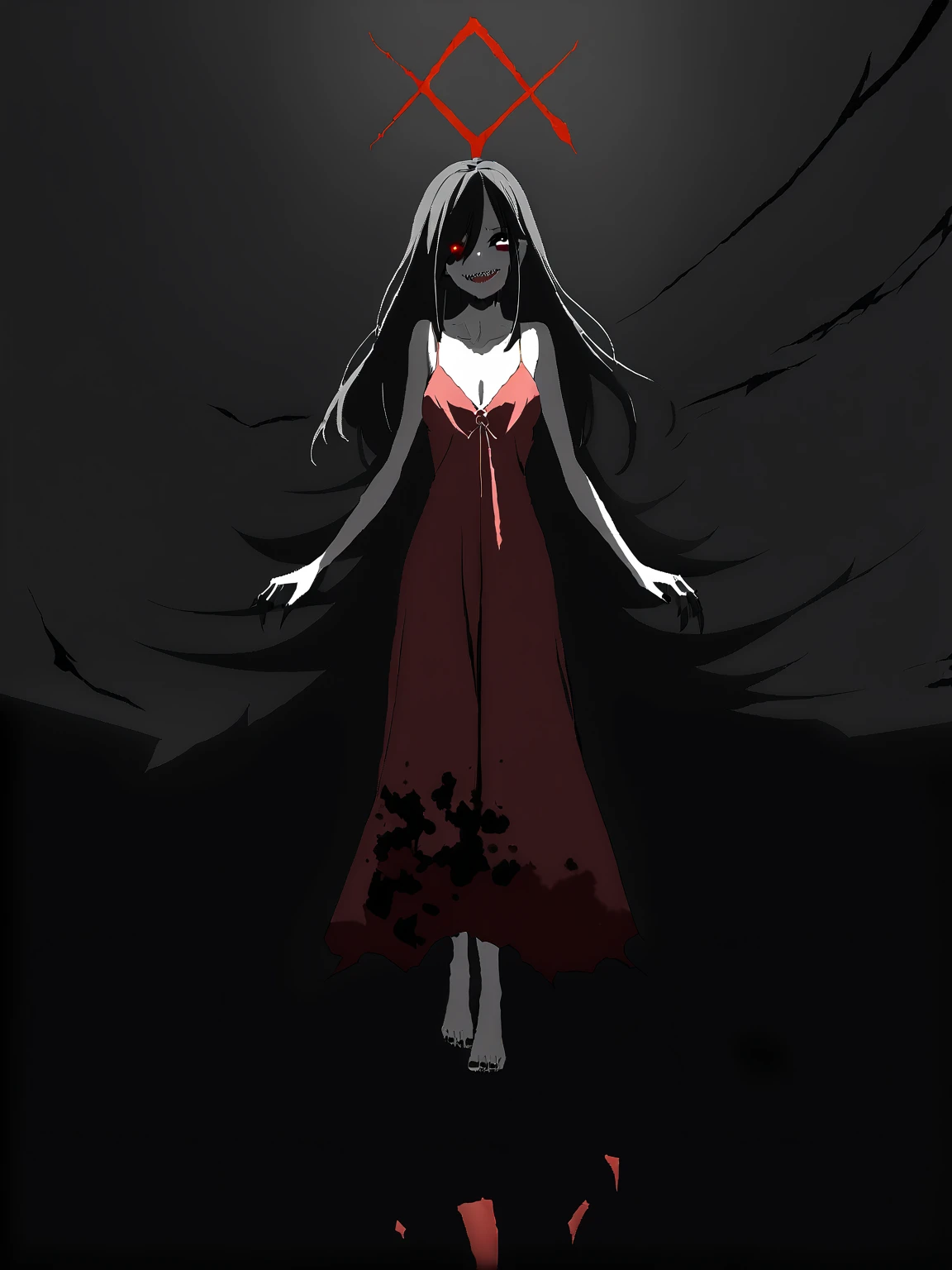 (ناهيدا وراء أونيمارو تمسك كتفه الأيمن، شعرها يتساقط، ليس لديها عينين، بشرتها رمادية، يخرج من فمها دخان أسود وتقول بصوت طفل: لماذا النعيم يا أونيمارو أليست جهنم أفضل؟)