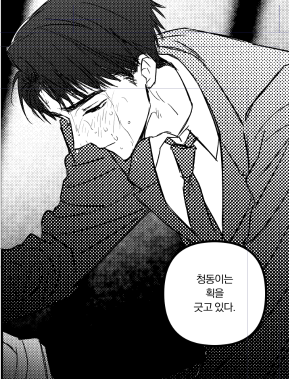 ~كانت صدغاه وجانب وجهه مبللين بما لا يُعرف إن كان عرقاً أم دموعاً.