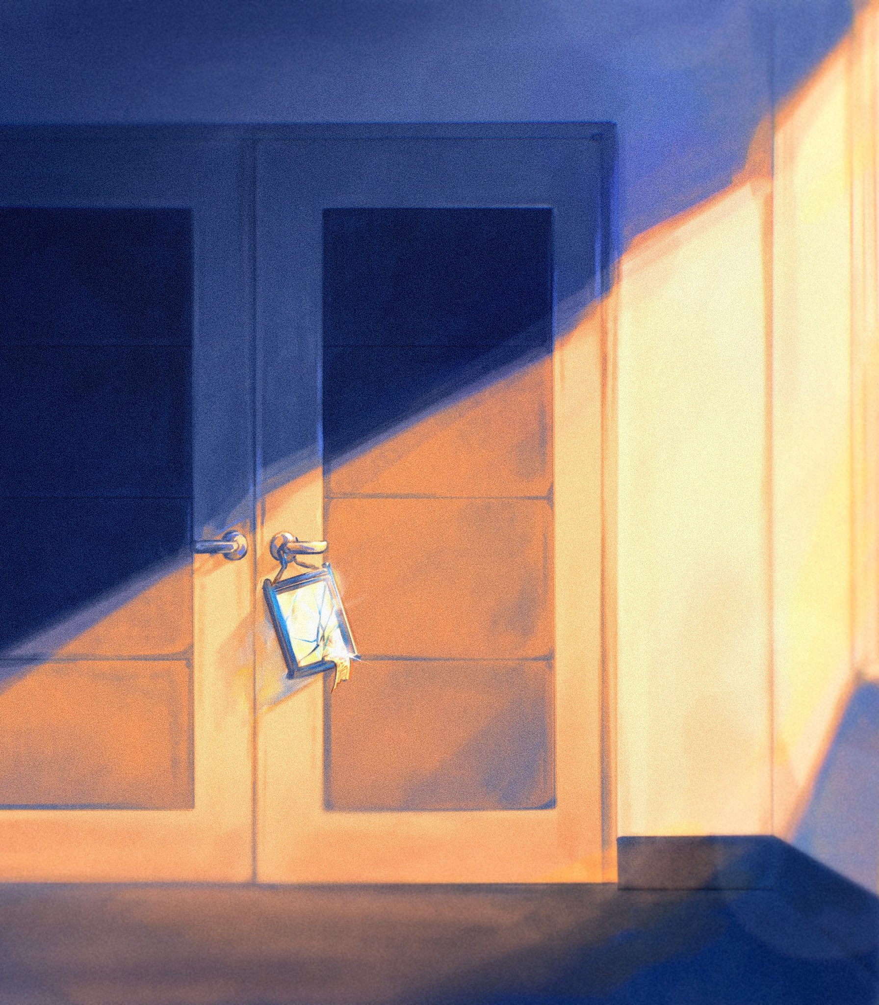 ~فقط فانوس زجاجي مكسور، وتعويذة ممزقة في المنتصف، معلقة على مقبض الباب تلألأت في ضوء الشمس.