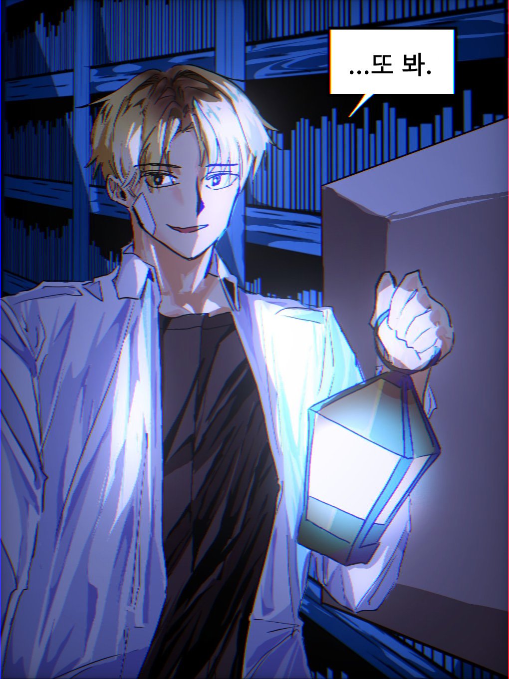 نظر العميل برونزي بسرعة إلى الجدار الذي ظهر بعد إزالة رف الكتب. رأيتُ نفس الشيء. مساحة مستطيلة متلألئة بلون معدني، مطابقة للمكان الذي خبأتني فيه السيدة غو يونغ-أون في محطة الكازينو ذات مرة...
