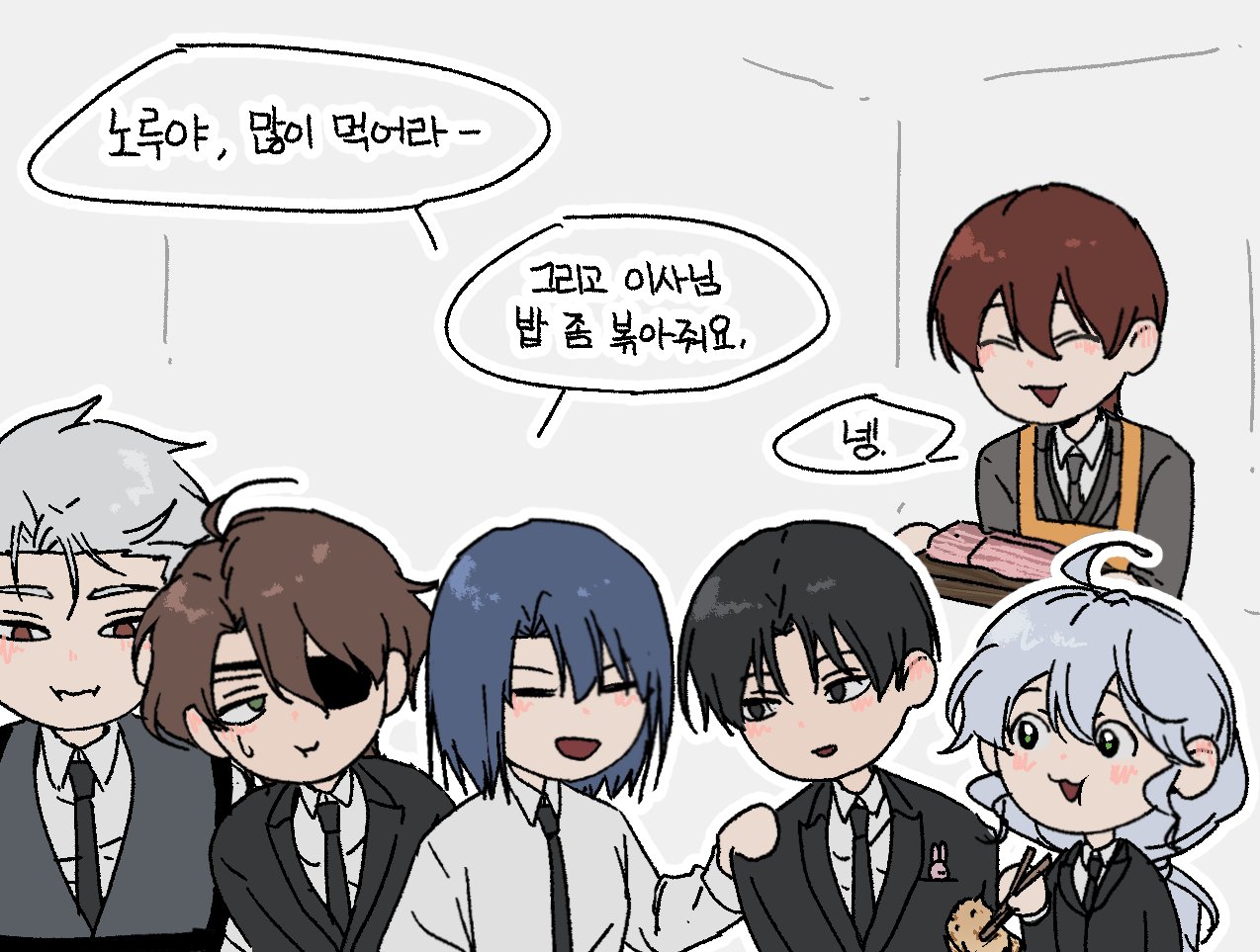 ~كان قائد الفريق لي جا-هيون يراقب كل هذه العملية بصمت. ابتسم رأس السحلية الأبيض. (ويبتسم كثيرا كأنه يشوف ابنه يتعلم الأكل لوحده لأول مرة 😭)