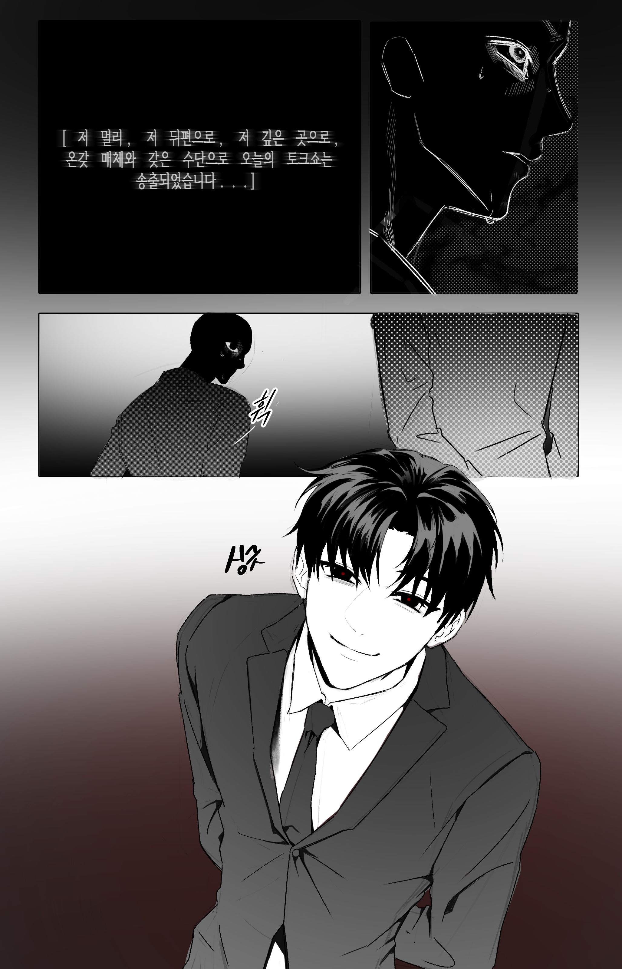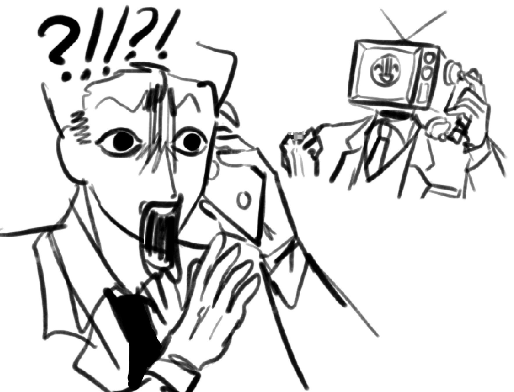 انفتح فم المذيع، وكشف عن فراغ أحمر قرمزي بداخله. تشوه محيطي، وأصبح لسان المقدم طويلًا، واتسعت عيناه...