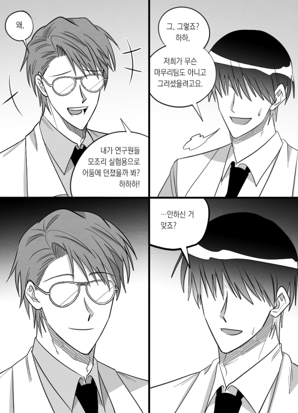 "هاه؟ كنتُ بالخارج لمقابلة. لماذا؟ هل تعتقد أنني ألقيتُ بجميع الباحثين في الظلام للتجارب؟ هاهاها!"
