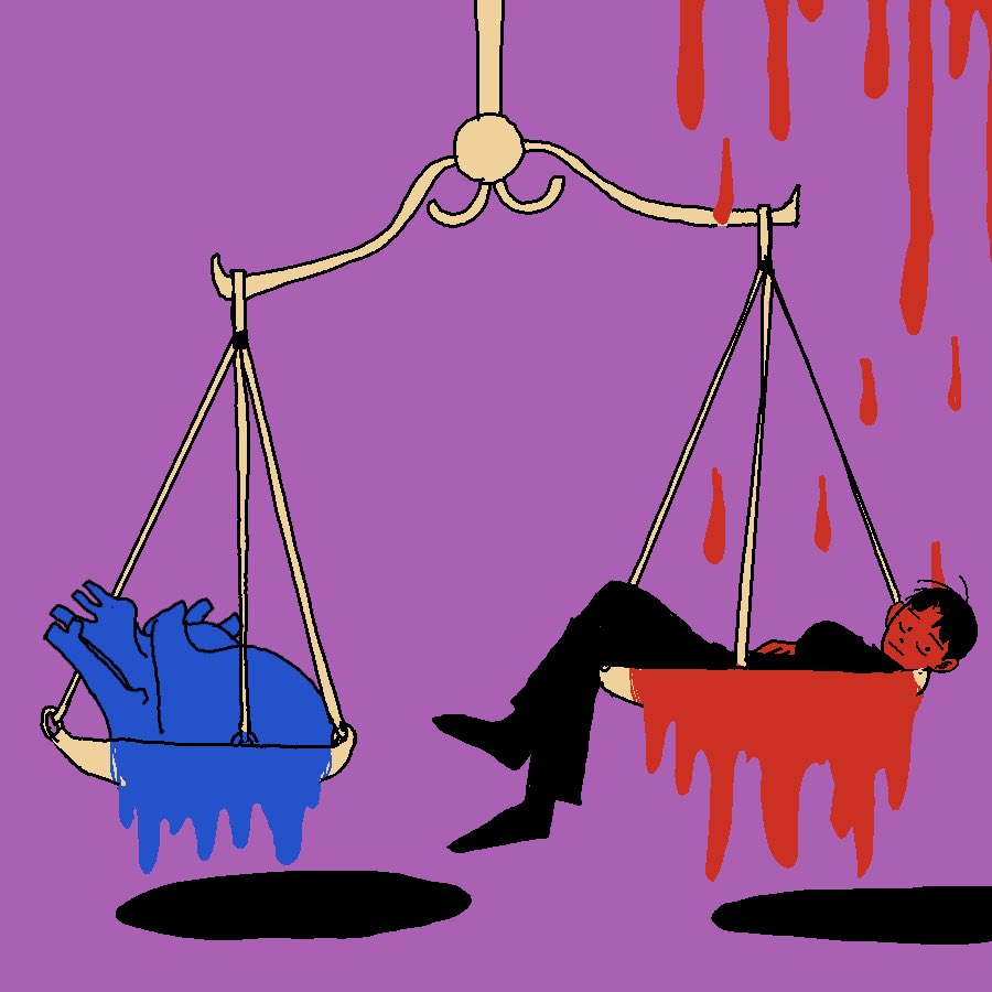 الوعي الأخلاقي للشخص وأعماله الصالحة، التي تتجسد في شكل قلب، تنبض وهي مطعونة بالسكين.