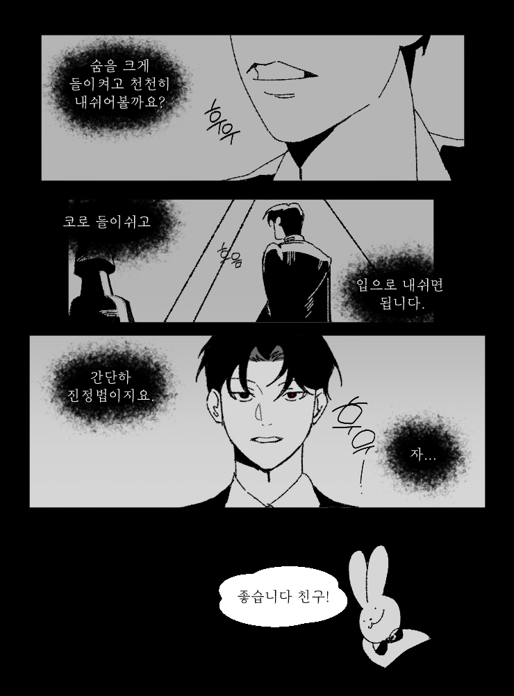 ~[هممم. هل نأخذ نفسًا عميقًا ونزفره ببطء؟ شهيق من الأنف وزفير من الفم. إنها طريقة بسيطة لتهدئة النفس. هيا...]