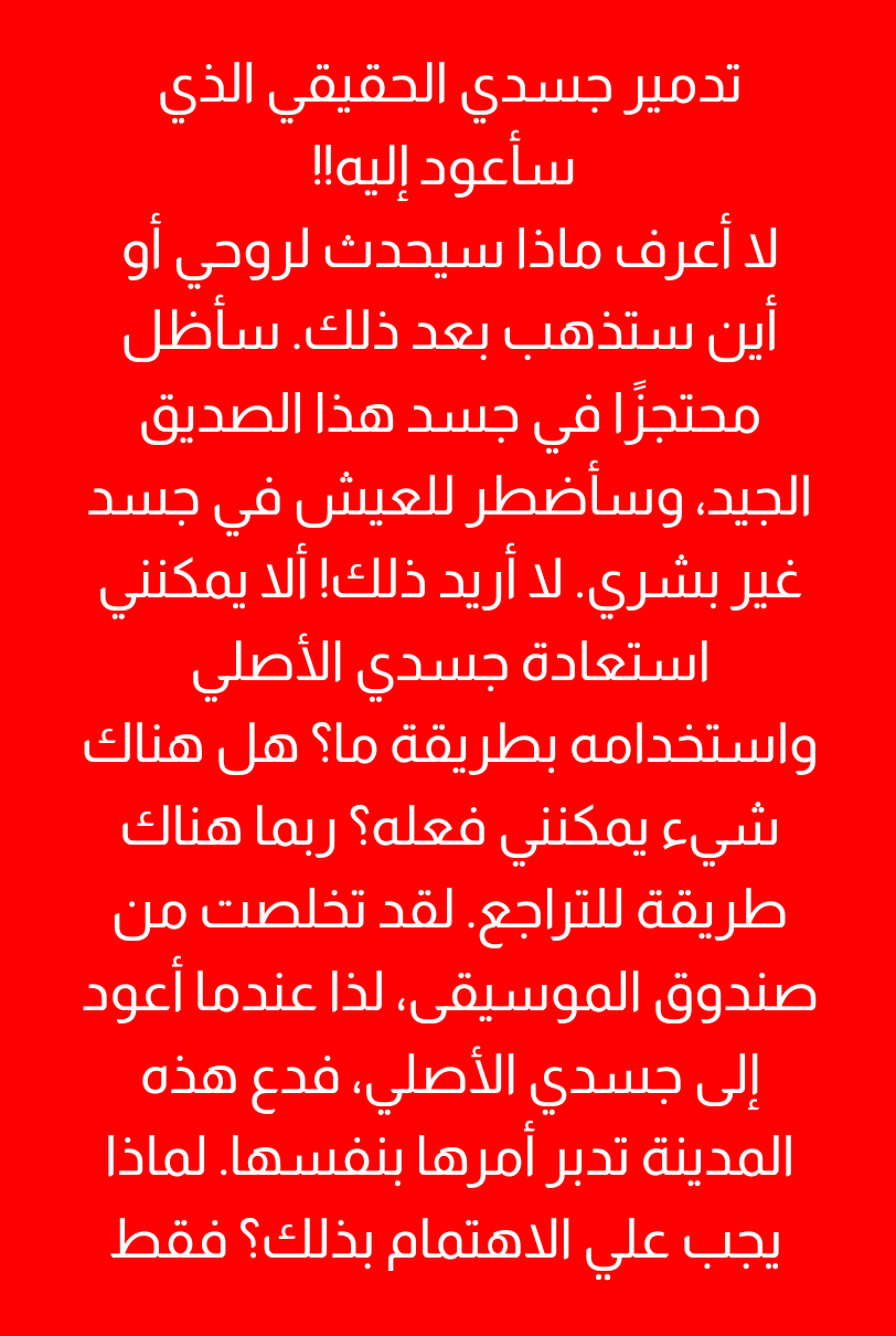 شر متقن، مُحكمٌ لدرجة أنه يخنق بغض النظر عن الخيار الذي يتم اتخاذه. إنه قيد عقلي يمنع أي حركة. جسدي الذي نجا بصعوبة من هذا الشر القاسي، أمسك صندوق الموسيقى...