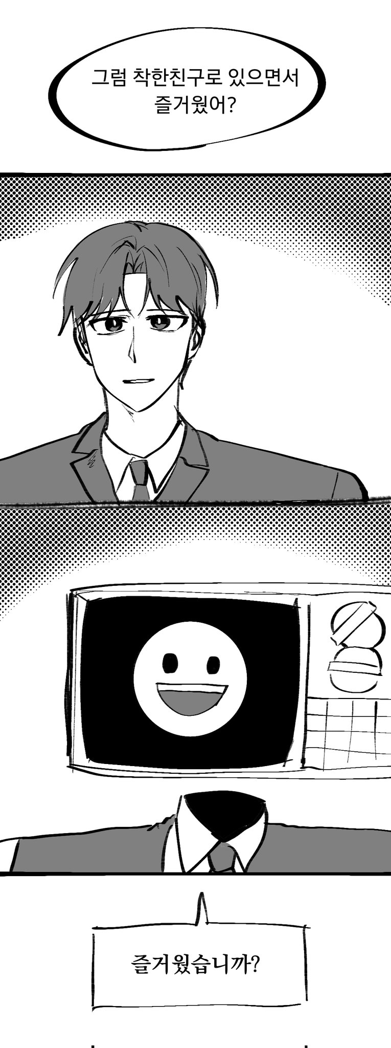 حتى وإن كان من يقف بجانبي هو هذا المذيع العظيم ذو رأس التلفاز الذي يسعى لجعلي أحد طاقم برنامجه الحواري... فقد كنا معًا لفترة طويلة.