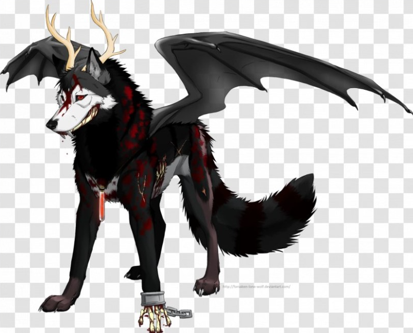 لقد وقف الشاب يمتلك شعر أبيض وعينان حمراوتان الجالس على صخرة وهو ينظر ناحية ذئب أسود يمتلك قرنين على رأسه و عينين حمراوتان وهناك عقد يحتوي شيء يشبه قنينة إختبار تحتوي على مادة حمراء بدون أن ننسى جناحان على ظهره