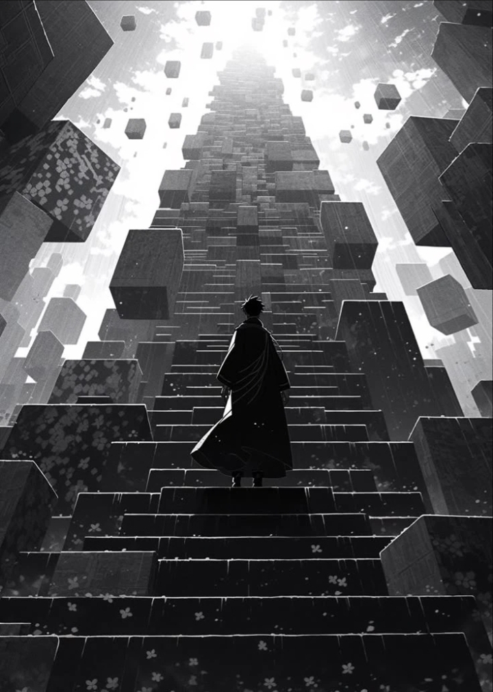 لأسباب مجهولة، وعندما استيقظت وجدت نفسي وحيدًا. أمامي هذا السلم، ولا أعرف إلى أين أذهب... لكني أعرف شيئًا واحدًا — أني خائف جدًا من المجهول الذي ينتظرني.