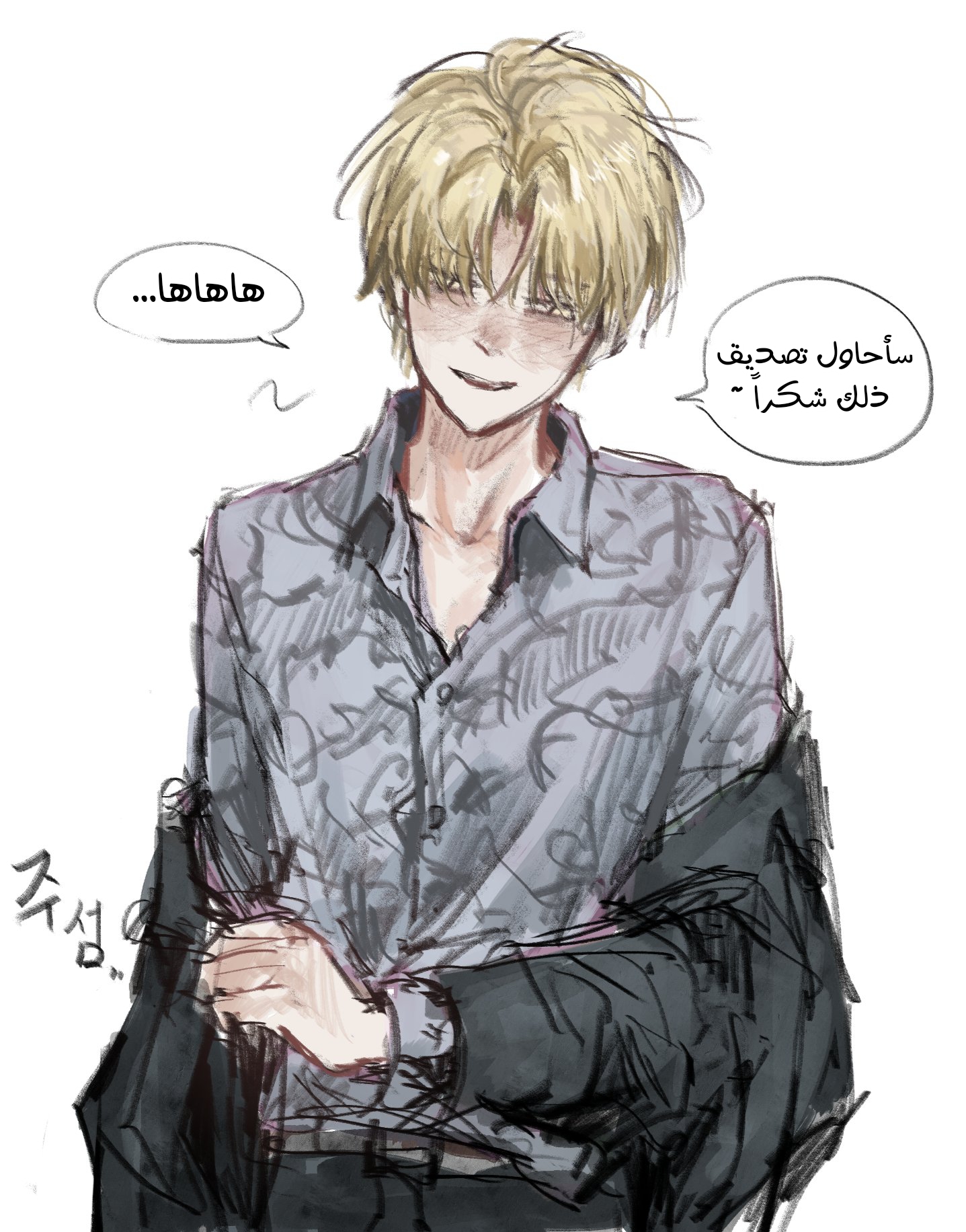 —«سماع ذلك منك بعد سماع حديثك الآن مفاجئ قليلًا~ اربط قميصك!»