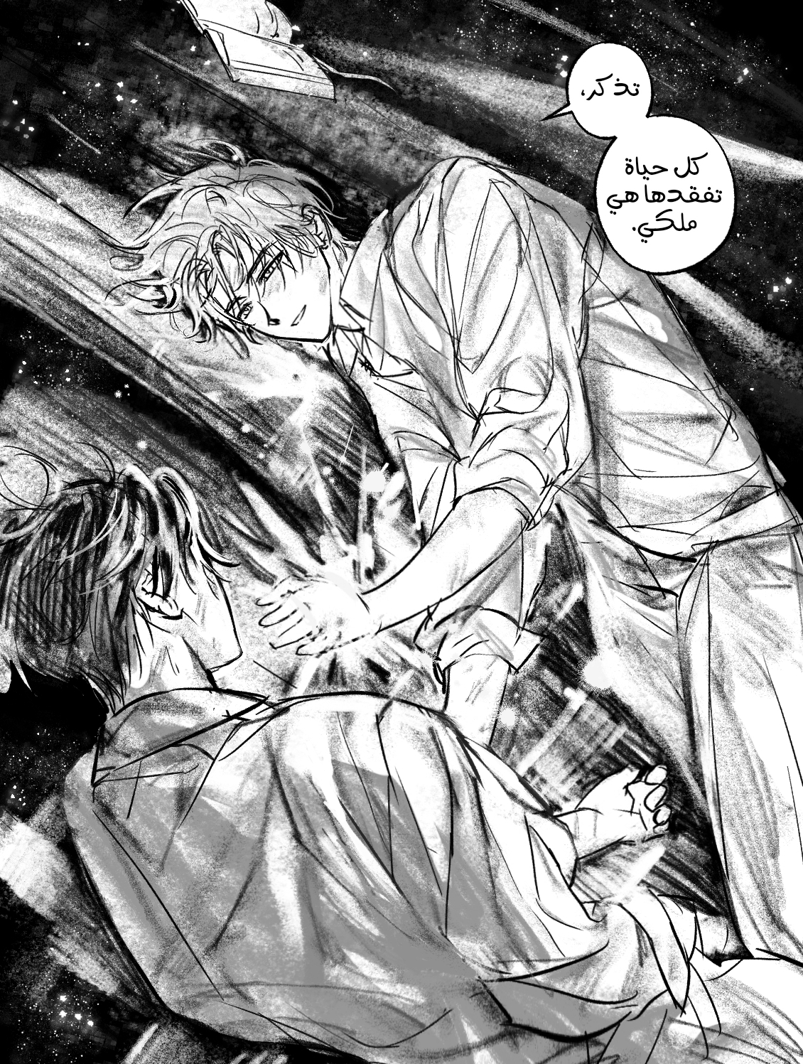 أمسكتُ بكتفه بقوة وألقيتُ تعويذة عزل الصوت.