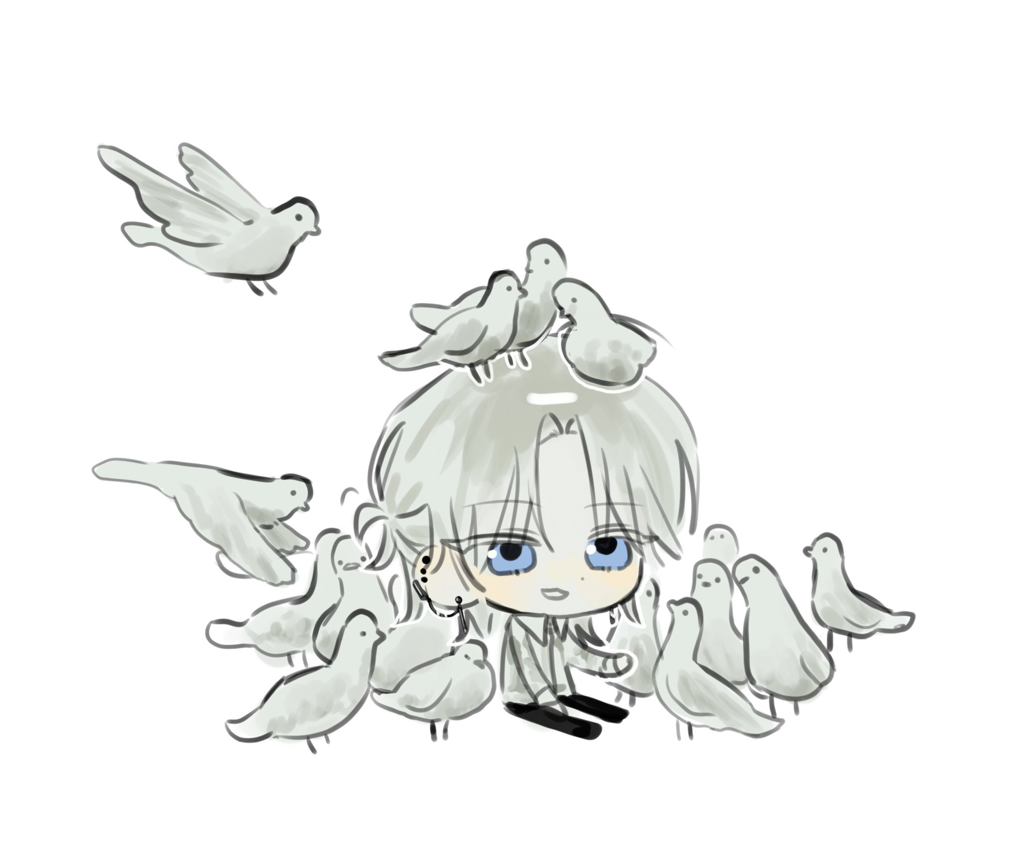 كان في الحديقة، يقود عدة حمامات بيضاء ويحاول إطلاقها في السماء.