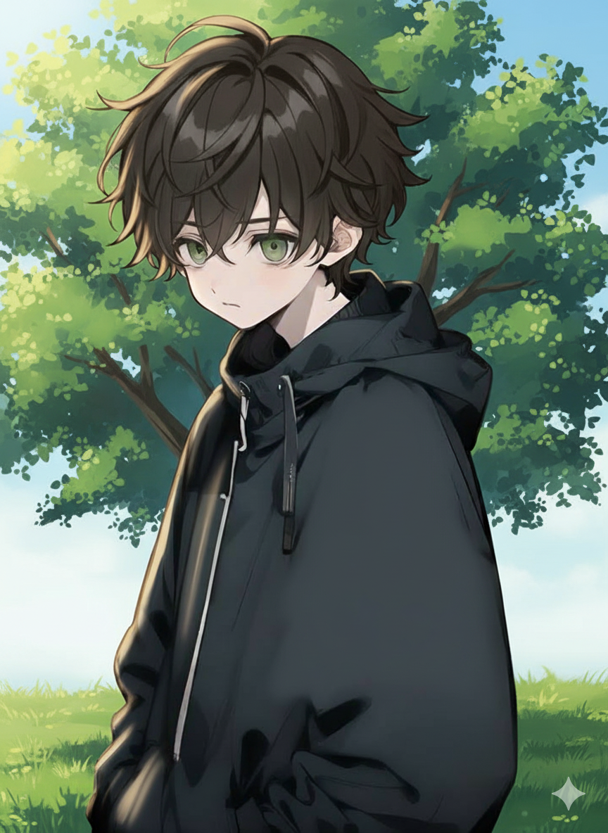 شَعره بنيّ داكن، وعيناه الخضراوان تعكسان حدةً ووعيًا أكبر من عمره.