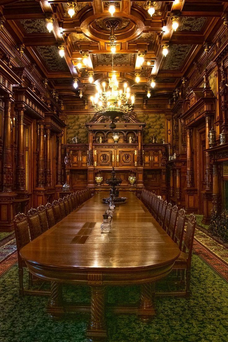 في وسط الغرفة تواجدت مائدة طويلة تصل لل7 أمتار مع وجود العديد من الكراسي الخشبية .