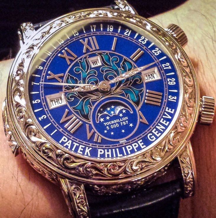 رون : " هذه ساعة التي تبدو عادية قمت قبل فترة بصنعها و هي مزيج بين ساعة ~الرولكس~ و ساعة ~السيد الكبير شيم~ باللون الأزرق و الأصفر الشمسي ، مرصع بالعشرات من المجوهرات ، في الداخل تم صنع الأرقام الرومانية و العقارب و شعار العائلة بالألماس الشفاف الشمسي.