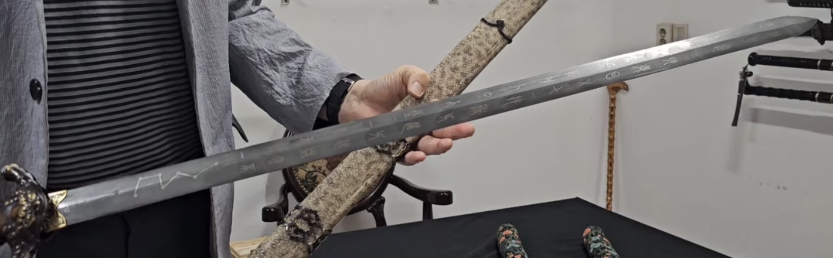 كانت على النصل نقوش بارزة على شكل دوائر وخطوط تشبه كوكبة النجوم كان واحداً فقط منقوشاً، على عكس سيف ساين غوم الكوري