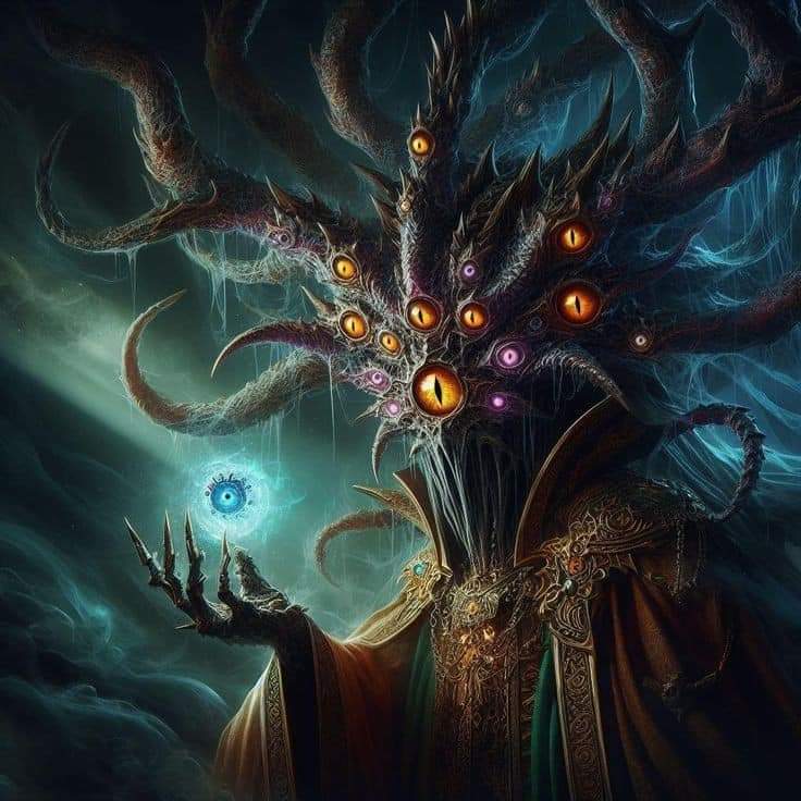 كان هناك شيء عملاق ي◻️◻️◻️ ، كان يرتدي رداء عملاق يغطي ما تحت رأسه الذي يشبه صخرة مليئة بالمجسات و القرون و الأعين لم يملك فم او انف فقط أعين كثيرة مرعبة تراقب شيء يشبه الكرة كان يحمله في يده.