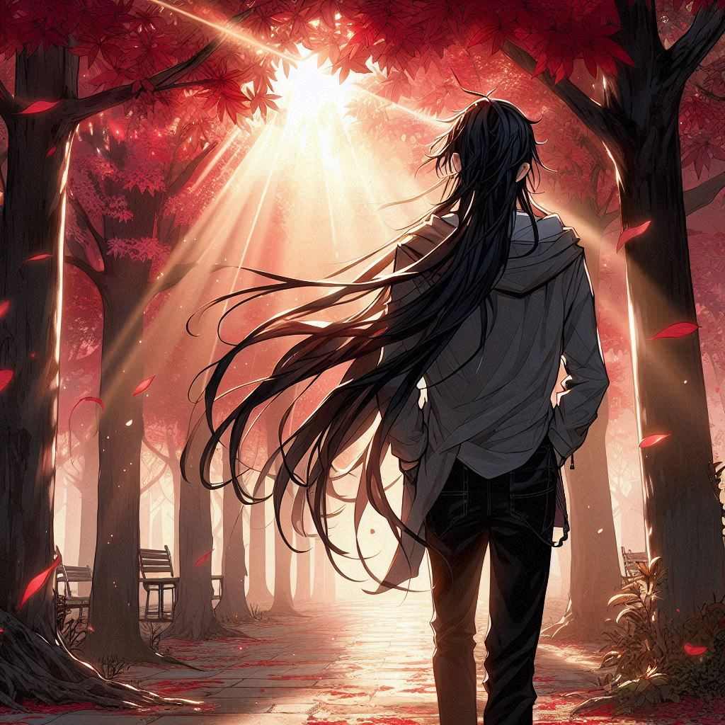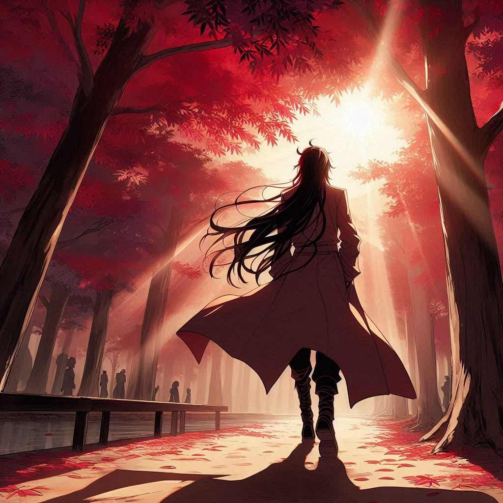 بعد دقائق من المشي وصل إلى عمق غير معروف من هذه الغابة ، مع هذا العمق لم تعد السماء او الشمس ظاهرة ، كل ما كان هو اللون الأحمر ، مع مرور ضوء الشمس على الأشجار تحول اللون من حوله إلى الأحمر الباهت كذلك.