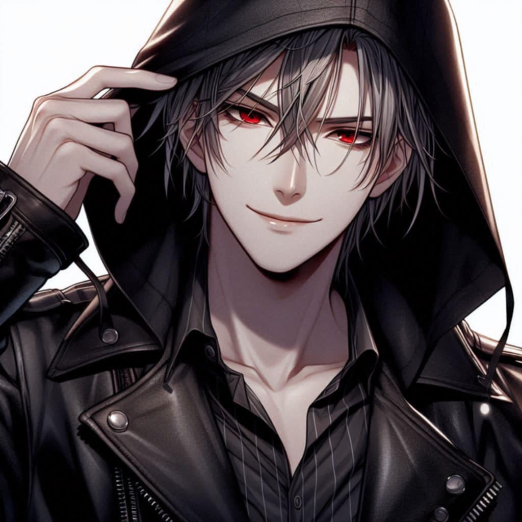 شاب شاحب مع وجه وسيم و شعر رمادي قصير يرتدي رداء جلدي اسود مع قلنوسة من نفس المادة و اللون.