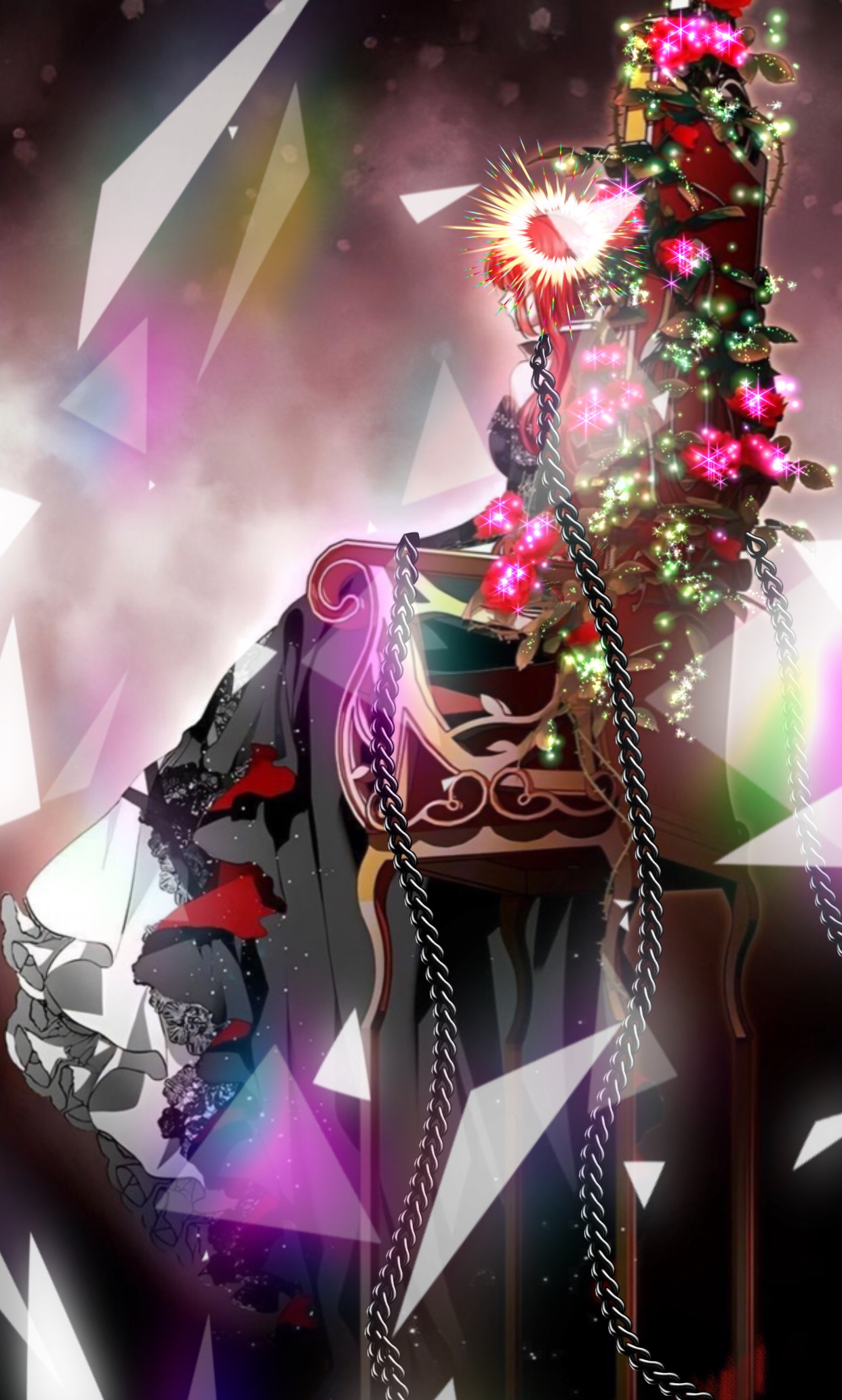 تاج من الضوء يطفو فوق رأسها جاعلًا منها تبدوا كهيئة مقدسة وعلى عكس تاجها المشع، سلاسل سوداء تقيد رقبتها و يديها تمتد للأسفل حيث لا يوجد قاع