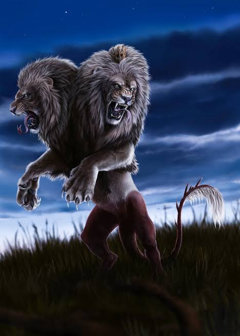 فِيْ تِلْكَ اَلْأَثْنَاءْ: دَاخِلَ بِئْرِ زِنْزَانَةٍاَلْوُحُوش وَفِي اَلطَّابَقِ اَلثَّالِثِ، كَانَ اَلزَّوْجُ كَوْمَ وَاَلَّذِي كَانَ رَجُلٌ طَوِيلٌ اَلْقَامَةِ، وَذُو شَعَرَ بُنِيَ طَوِيلٌ، وَعُيُون خَضْرَاءَ مَعَ زَوْجَتِهِ لَيْلِيًّا وَاَلَّتِي كَانَتْ أَقْصَرَ مِنْ زَوْجِهَا، وَذَاتَ شِعْرٍ أَشْقَرَ قَصِيرٍ وَعُيُونُ بِنْيَةٍ يُقَاتِلَانِ اَلْأَسَدُ اَلذَّهَبِيَّ ذُو اَلرَّأْسَيْنِ وَهُوَ مَخْلُوقٌ نَادِرٌ فِي بِئْرِ قَرْيَةٍ دُونَامِيْ، وَقَدْ كَانَ هَذَا اَلْأَسَدُ ضَخْم اَلْجُثَّةِ بَعْضَ اَلشَّيْءِ، ذَاتَ جِلْدٍ أَصْفَرَ سَمِيكٍ، وَمَخَالِبُ طَوِيلَةٌ وَأَنْيَابٌ حَادَّةٌ وَكَمَا هُوَ اِسْمُهُ مَا كَانَ يُمَيِّزُ هَذَا اَلْأَسَدُ هُوَ أَنَّهُ يَمْتَلِكُ رَأْسَيْنِ عَوَضْ رَأْسِ وَاحِدًا، فَرَأَسَ اَلْأَوَّلُ يُدَافِعُ بِهِ عَنْ نَفْسِهِ وَالثَّانِيَ يُهَاجِمُ بِهِ بِكُلِّ قُوَّةٍ عَلَى أَعْدَائِهِ أَوْ فَرَائِسِهِ. ا