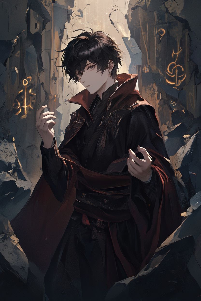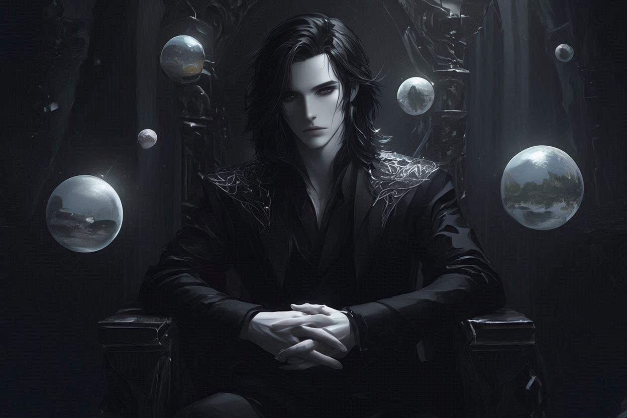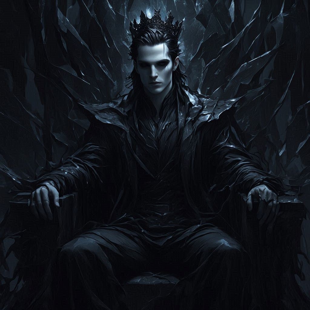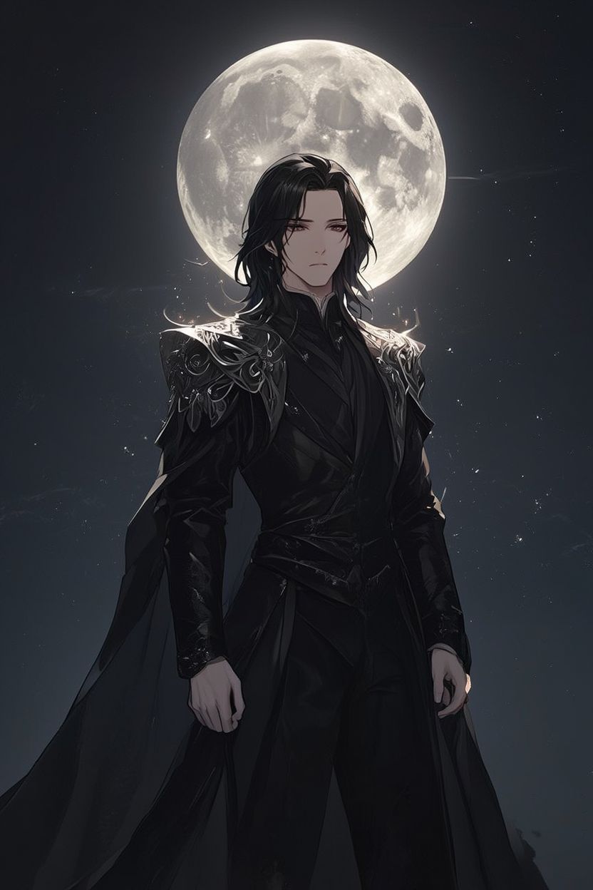 ملامحه الجميلة الباردة، وملابسه الملكية السوداء المزخرفة بنقوش فضية معقدة على الكتفين، تمنحه حضورًا لا يُقهر، كمن يقف دائمًا فوق كل شيء من حوله.