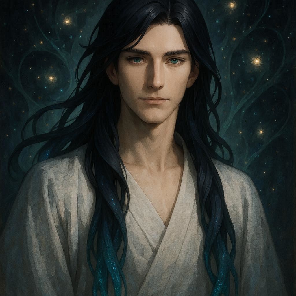 عيناه زرقاء مخضرة عميقة وهادئة، وشعره الأسود الطويل والناعم ينساب تحت كتفيه حتى ظهره كالشلال، بينما تتوهج أطرافه بلونين أخضر وأزرق خافتين.
