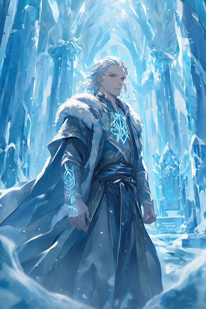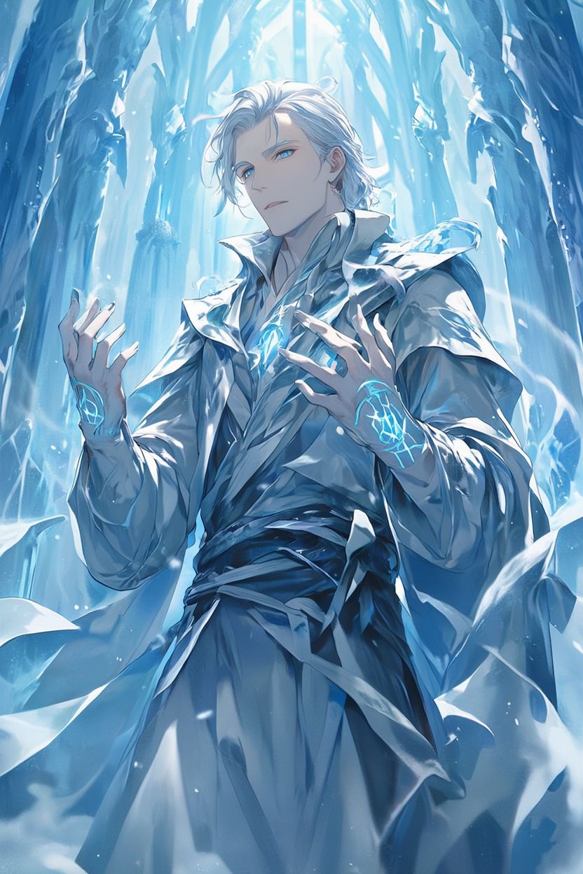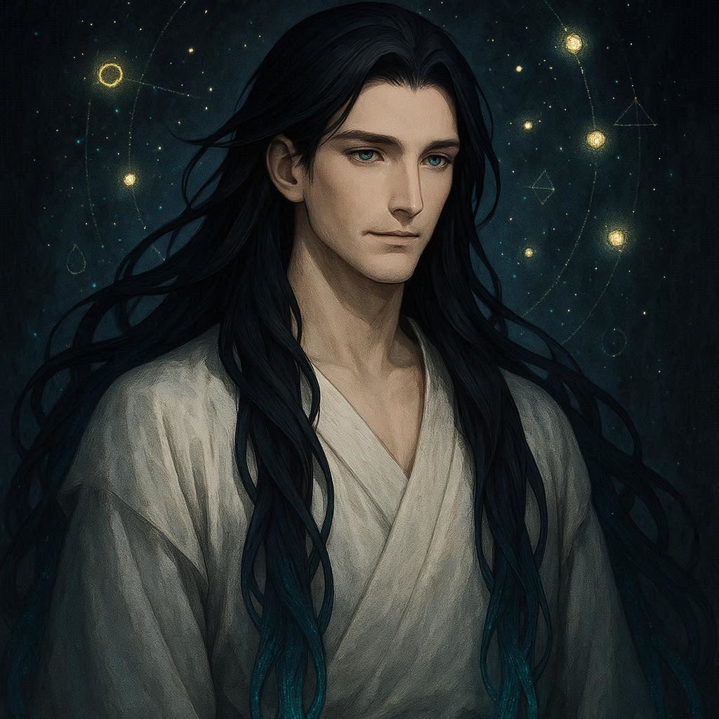 يملك جسدًا عضليًا متناسقًا تكسوه عباءة سوداء داكنة، بينما تتوهج عيناه بلون أزرق عميق كأنهما نافذتان نحو عالم الروح.