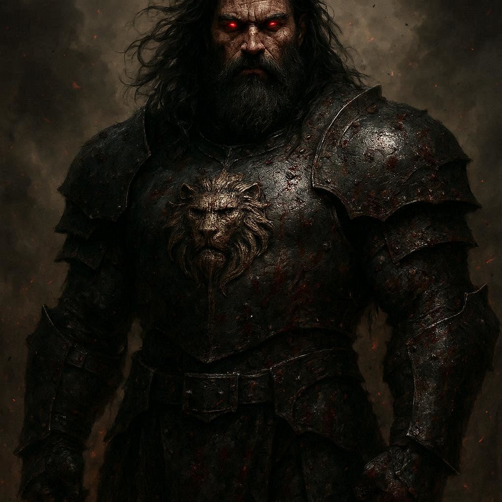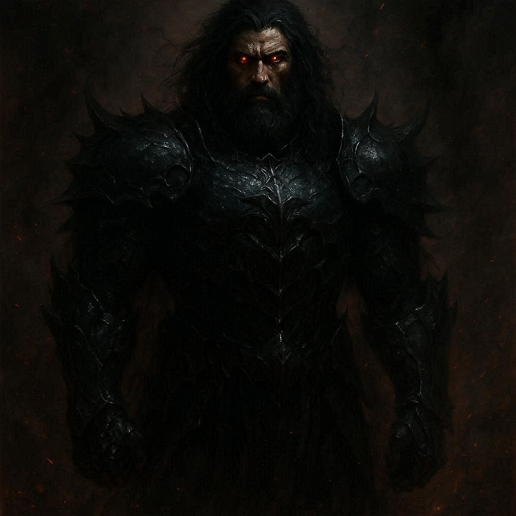 محارب عظيم طويل القامة لدرجة تجعله يبدو كأنه نصف عملاق، مرتديًا درعًا أسود ثقيلًا ملطخًا بدماء لا تزول.