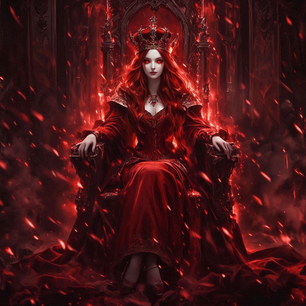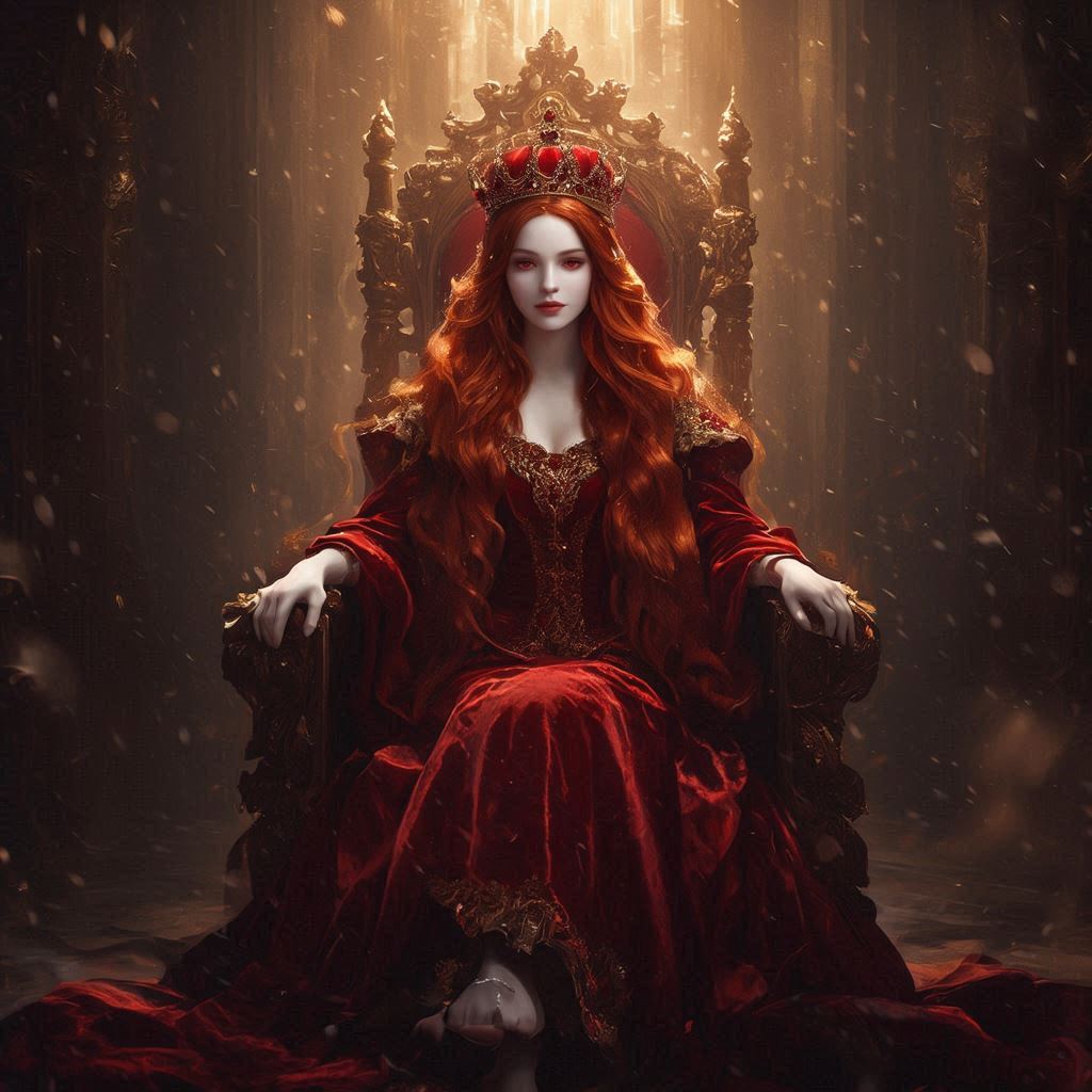 رفع رأسه فرأى امرأةً ذات شعرٍ أحمر كالدم، بشرةٍ بيضاء كالثلج، وعيونٍ حمراء زاهية. كانت ترتدي زيًّا ملكيًا كلاسيكيًا، تمامًا كما سمع عنها لم تكن غريبة عليه لقد رأها في قاعة ملك الملوك بنر عندما شاهد التاريخ العصر دمار و الخراب.