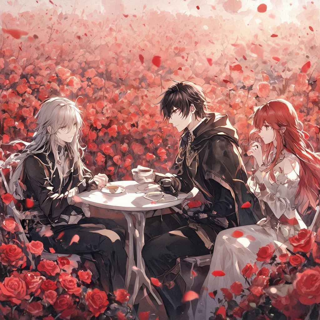 في حقلٍ من الورود الحمراء يمتدّ إلى ما لا نهاية، جلس فالين وأليسيا وأرين. كان وجه أرين مشوشًا، وعلى ملامحه أثر صفعةٍ واضحة، بدا مرتبكًا كما لو أن كلماتٌ قاسيةً ما تزال تدور في رأسه.
