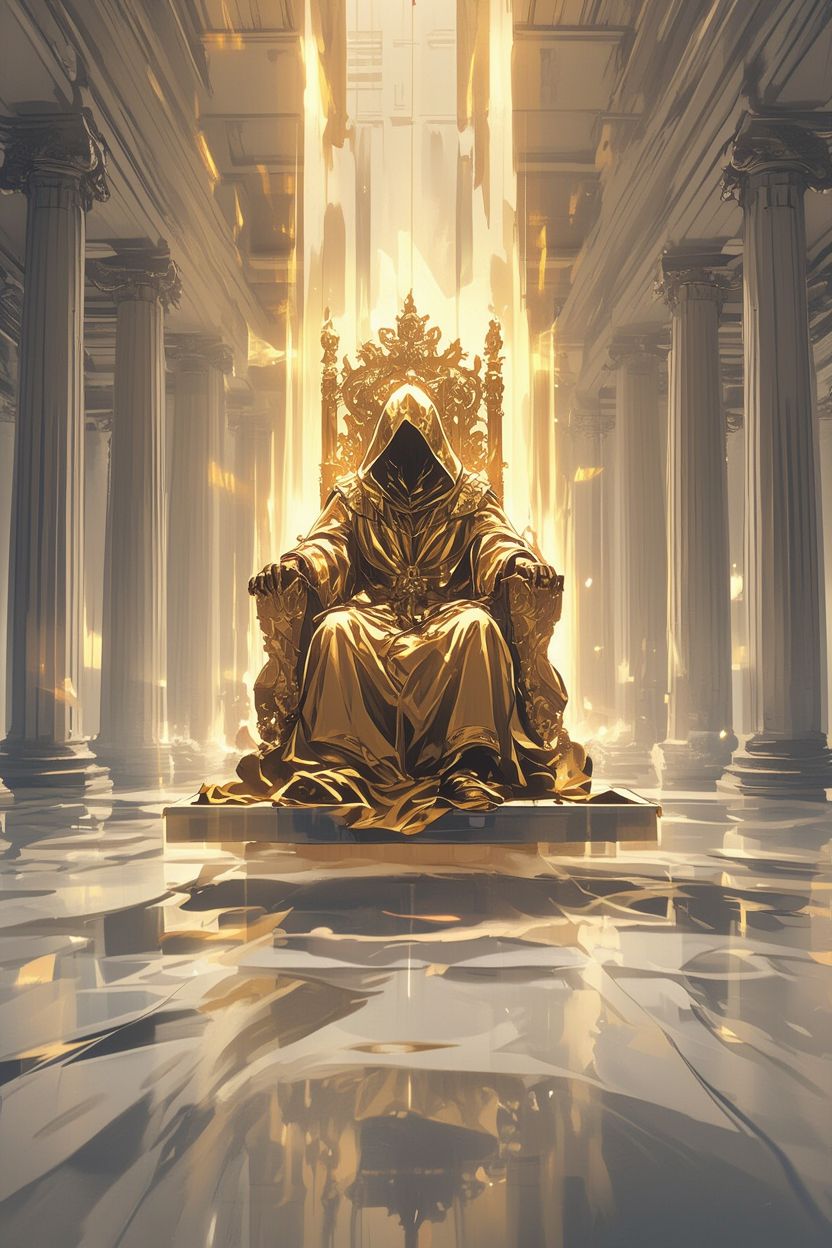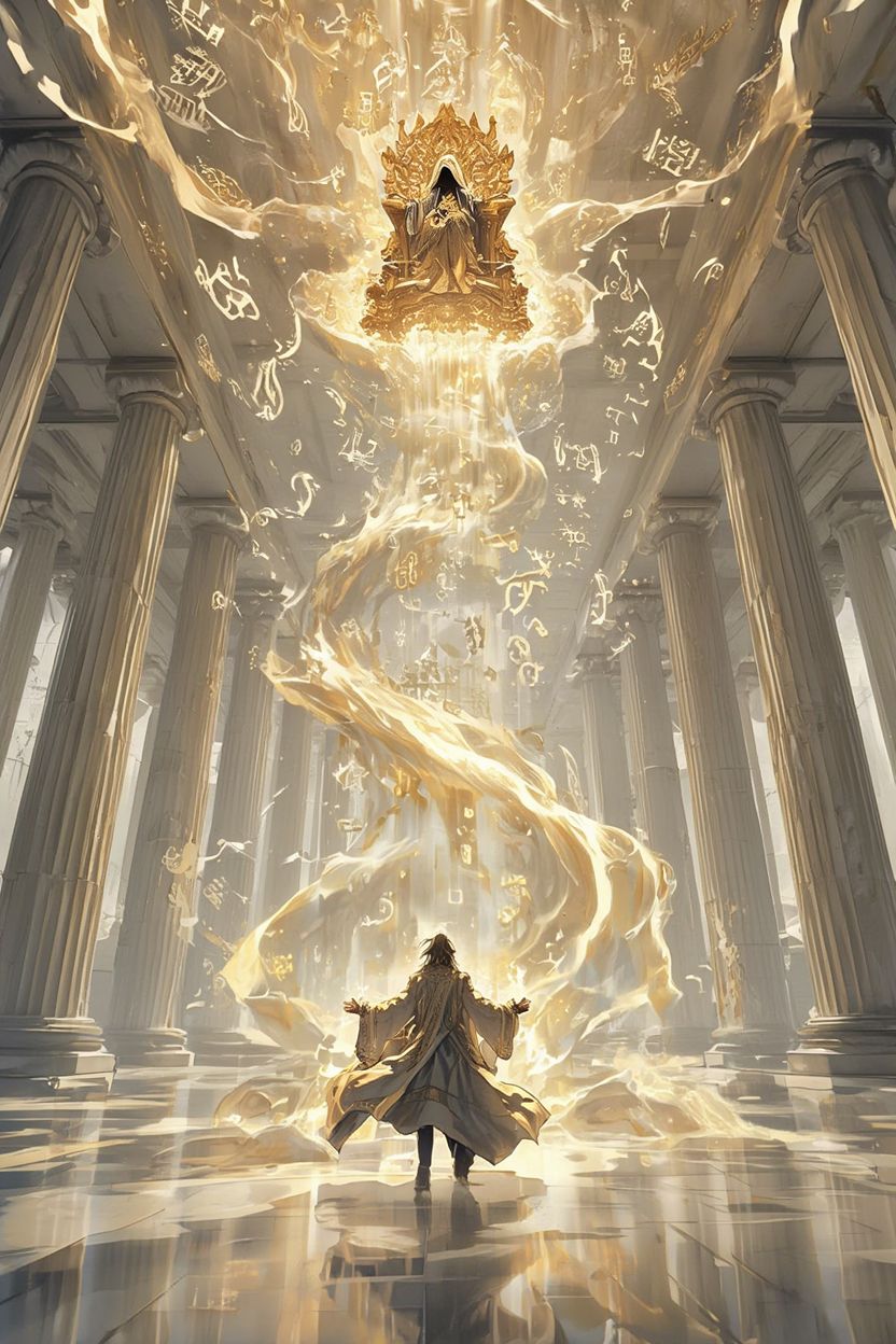 في أعلاها، كان هناك عرش ذهبي معلق في الهواء، يجلس عليه كيان قوي ومهيب، يرتدي رداءً ذهبيًا يغلف جسده بالكامل، وغطاء رأس يشبه القلنسوة، تنبعث منه هالة طاغية من الهيمنة والإخضاع.