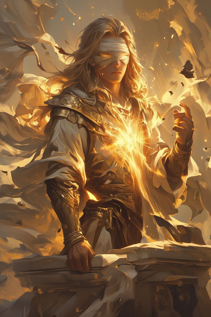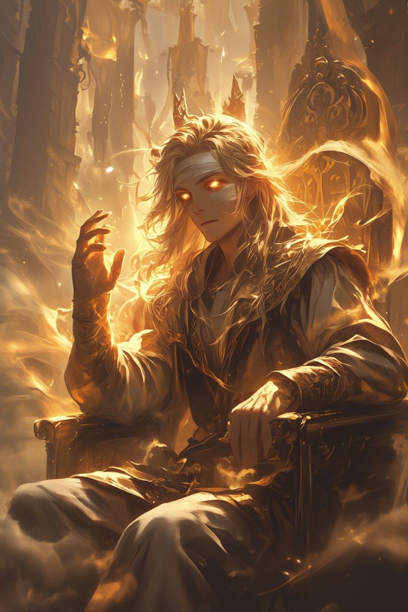 تحرر من القيود التي كبّلت حركته وأفكاره، وأسقط عن نفسه كل عائق حاول تثبيته. غير أن سلالًا ذهبية التفّت حوله فجأة، وأحكمت قبضتها، مقيّدة الهالة في كيانه.