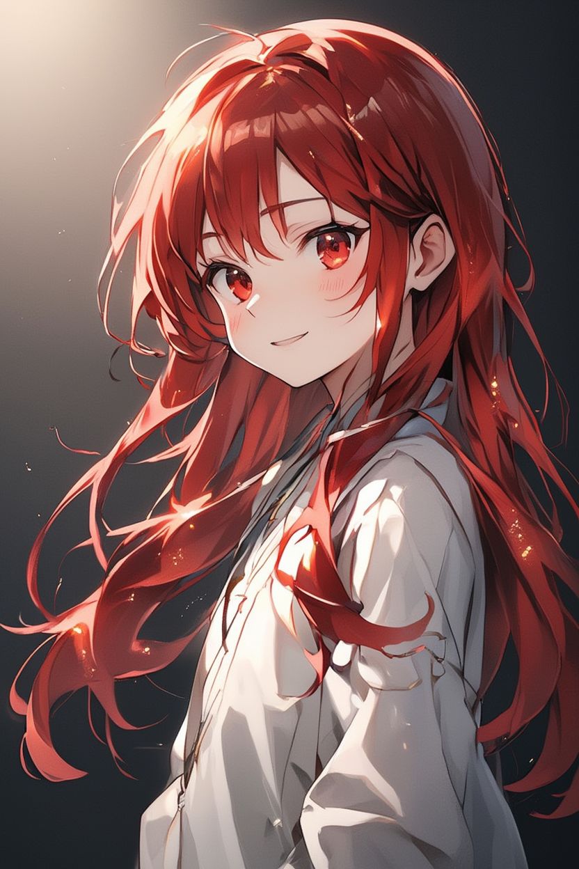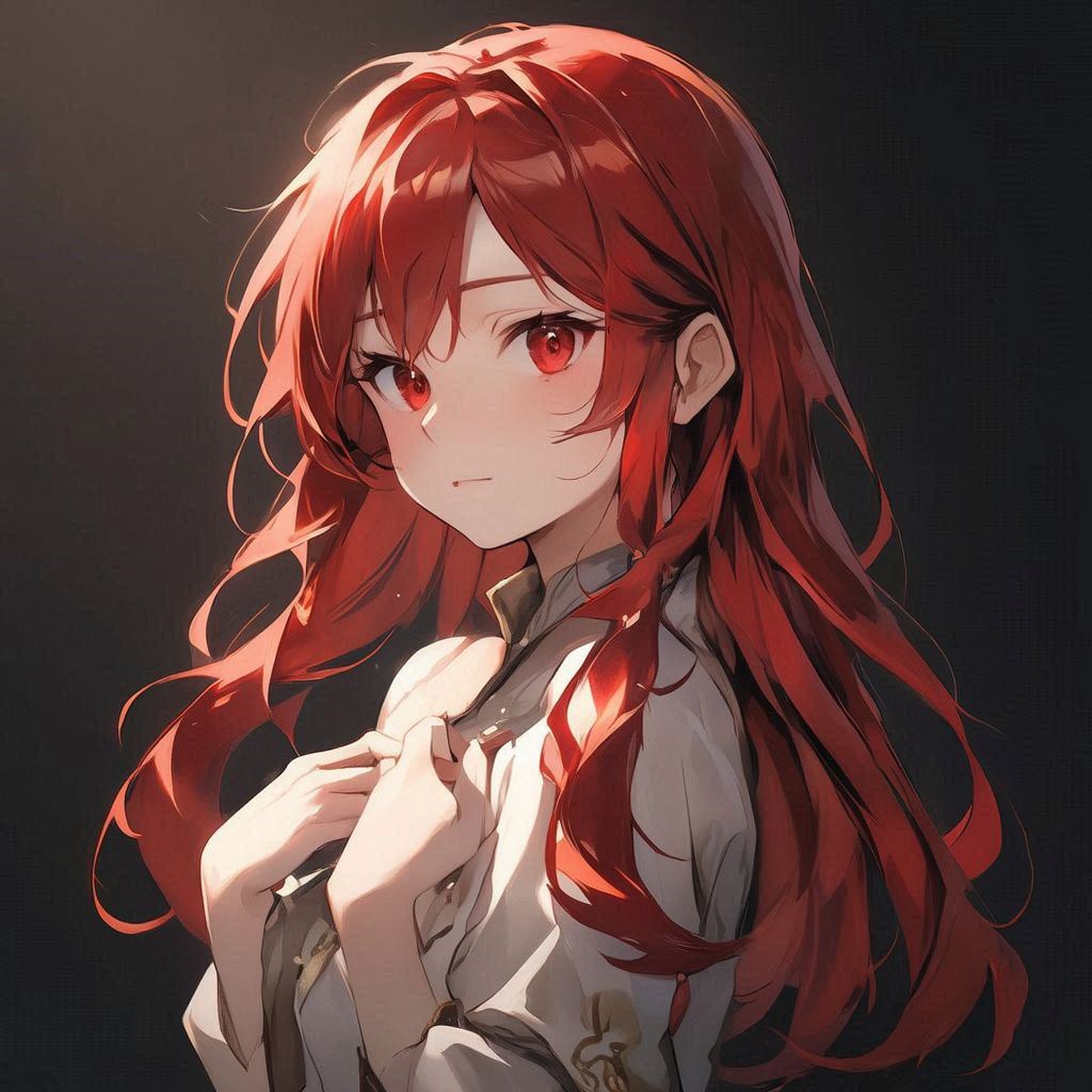 شعر أحمر، عيون حمراء، وبشرة بيضاء تنبض بالحيوية.