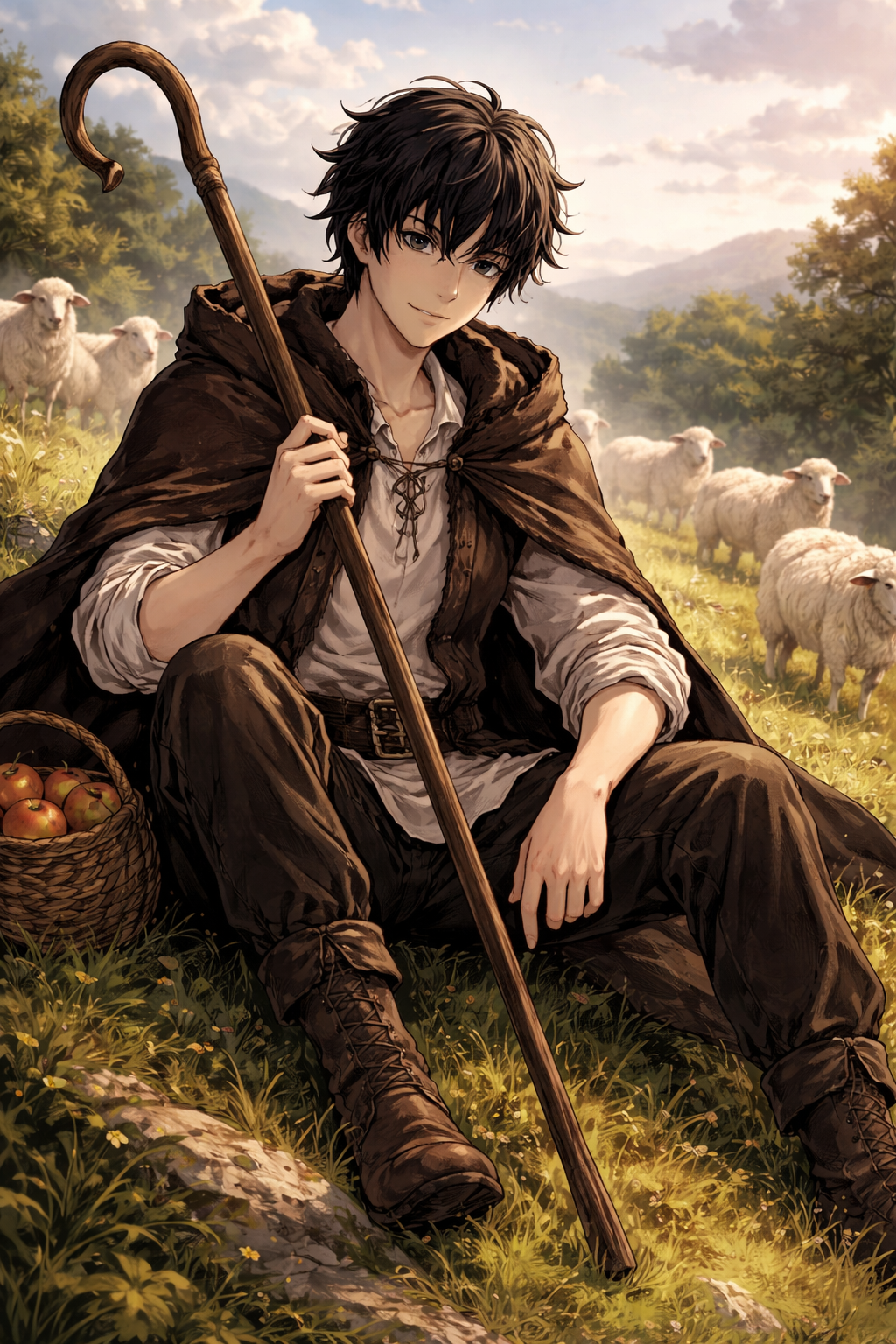جلس راعٍ بسيط فوق تل أخضر مغطى بالعشب،