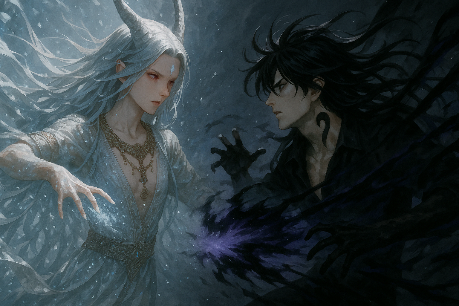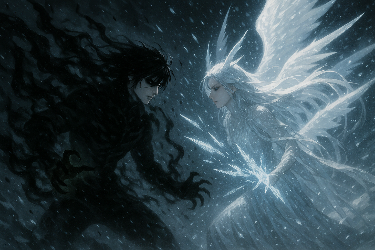 الأرض انشقّت تحت جسده. رفعت يدها مجدداً، وأمطرَت آلاف الأسهم الجليدية من السماء. تمايل لين في الهواء، طاقته السوداء تتأجج من خلفه.