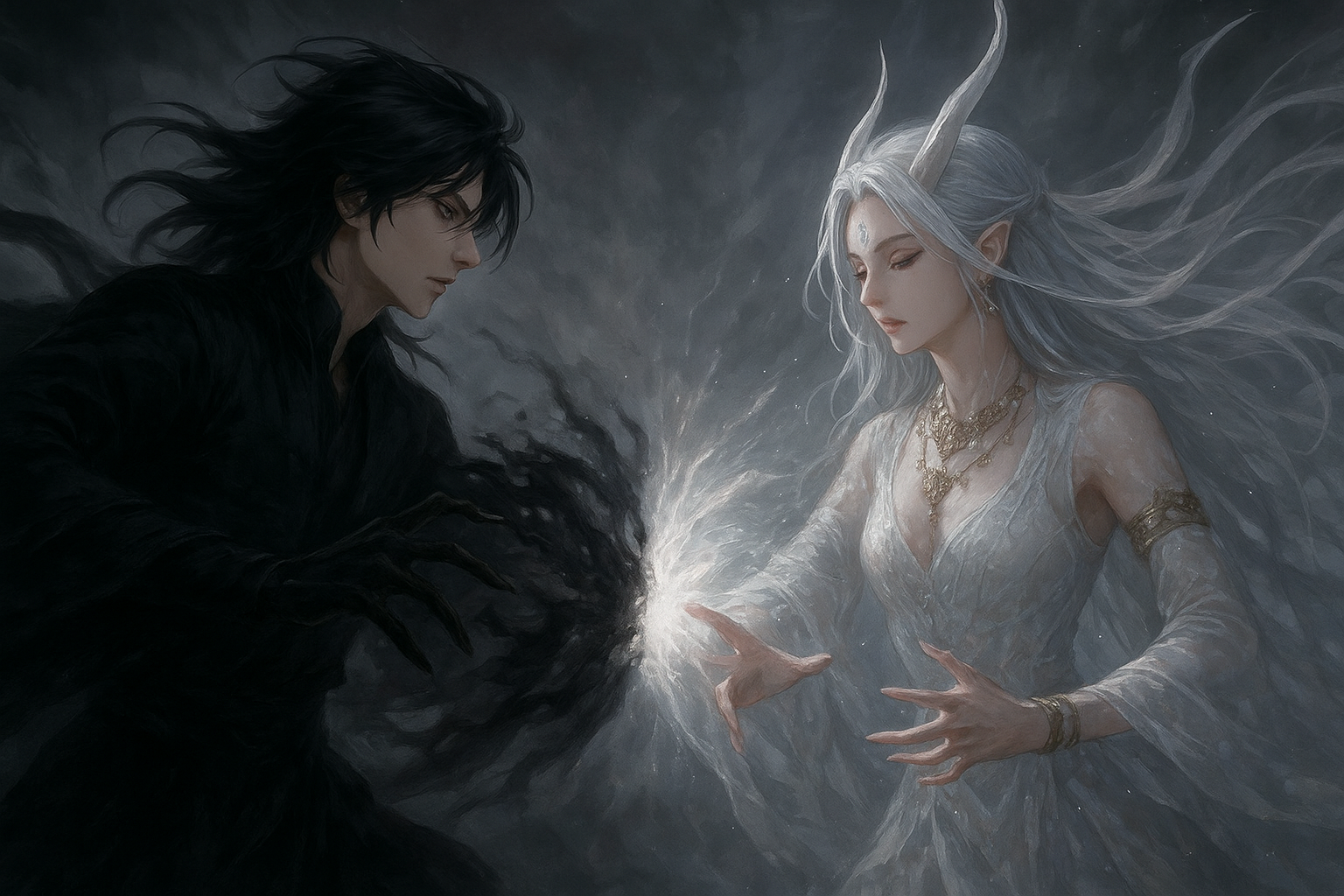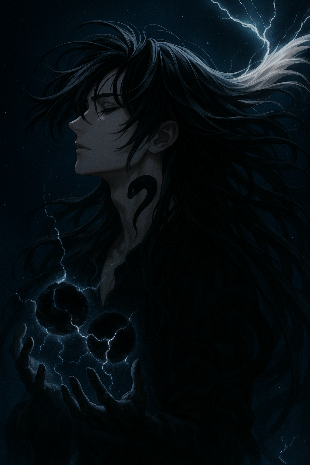 مدفوعاً فقط بغريزته، حشد لين قوته. تراكمت المانا السوداء بين يديه، مشكّلة كرتين داكنتين من الطاقة الخام. بدأت الكرتان تدوران حول بعضهما، ومن احتكاكهما وُلد شرر أسود متفجر في السماء.