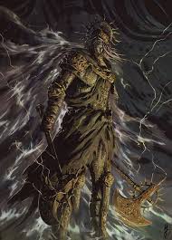 فارس هيكلي تنبعث منه هالة موت من الرأس حتى أخمص القدم، ممسكًا بفأسين مشحونين بالكهرباء.