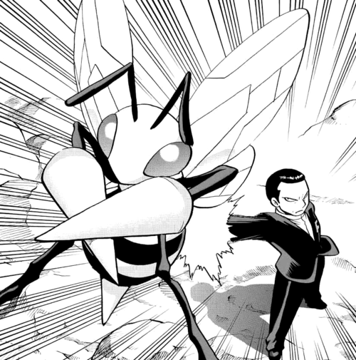 ذلك الرجل المسمّى "ساكاماكي" كان يتحكم في وحش يشبه الدبور، يمتلك شوكتين ضخمتين كسلاحين في ذراعيه الأماميتين، وكان يلهو تمامًا بـ"بيكاتشو" خاصته.