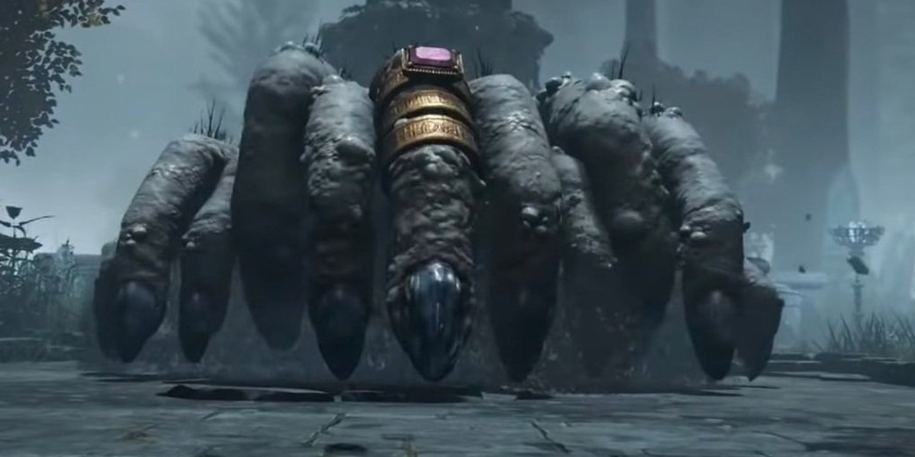 في هذه اللحظة، كشف الأشواك عن حقيقتها: كانت يدًا عملاقة ذات أصابع كثيرة، مزينة بخواتم من الجواهر!